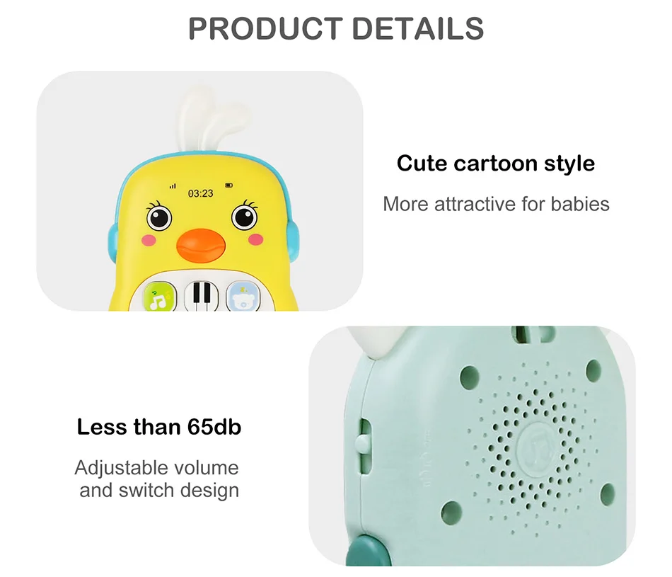 1. Изготовлен из высококачественного АБС-материала, который является более прочным. 2. Мягкий силиконовый прорезыватель, который может быть укушен и безопасен для детей. 3. Мягкое освещение, не повредит глаза ребенка. 4. Звук менее 65 децибел и имеет регулируемую громкость, не повредит слуху ребенка. 5. Тихая и мягкая музыка, помогает ребенку спокойно спать. 6. Дизайн шнура, Ковенант для переноски и предотвращения падения. 7. Милый мультяшный стиль, более привлекательный для малышей.