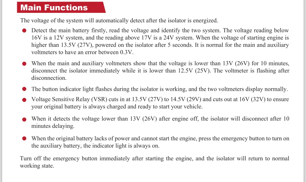 Универсальный Смарт-изолятор аккумулятора высокой мощности 250 А, 12 В, 24 В, контроллер вкл/выкл, двойное управление. Спецификация: 1. Входное напряжение: 12 В 24 В рабочее напряжение и напряжение нагрузки 2. Постоянный ток: 250A нормально открытый 3. Пиковый ток: 250A нормально разомкнутый 4. Автоматическое подключение напряжения (задержка 5 секунд): 13,5 в-16 В (Рабочее напряжение 12 В)/27 в-32 В (рабочее напряжение 24 В) 5. Автоматическое отключение напряжения (задержка 5 секунд): 12,5 в 6. Перенапряжение: 16 В/32 В 7. Вес: 462 г 8. Размер: 15,2 см x 14,7 см x 4 см 9 посылка: 1 шт. x изолятор аккумулятора Особенность: -Низкое энергопотребление и энергосбережение -Высококачественные композитные корпуса защищают от суровых температур и сильных при условиях вытяжки -Наличие латунных или медных контактов там, где указано для длительного ношения -Все детали изготавливаются в соответствии со строгими требованиями к качеству. Реле играют большую роль в постоянно растущем количестве электроники в автомобилях. Основные функции: -Высокотоковый изолятор батареи 250 ампер изолятор батареи и реле, предотвращает нагрузки на вспомогательную батарею от Слива пусковой батареи. -Отлично подходит для изоляции второго батарейного блока, что позволяет защитить аккумулятор, продлевает срок службы батареи -Автоматически проверяет напряжение, когда батарея типов низка, она включит функцию заряда Примечание: -Напряжение системы будет автоматически определять после сенсергизации изализатора. -Выключите аварийную кнопку сразу после запуска двигателя, и острователь вернется в нормальное рабочее состояние. -Пожалуйста, не ставьте продукт под воздействием воды. Как подключиться: пожалуйста, любезно прочитайте инструкцию по эксплуатации и изображения. * Более подробная информация по руководству *