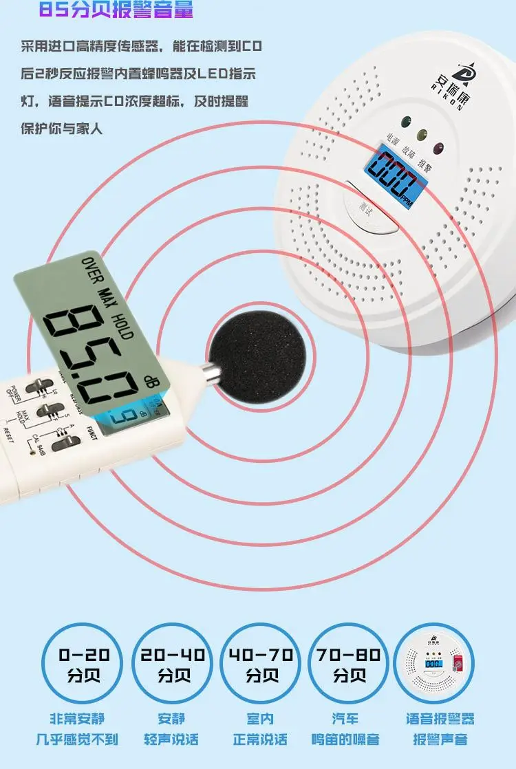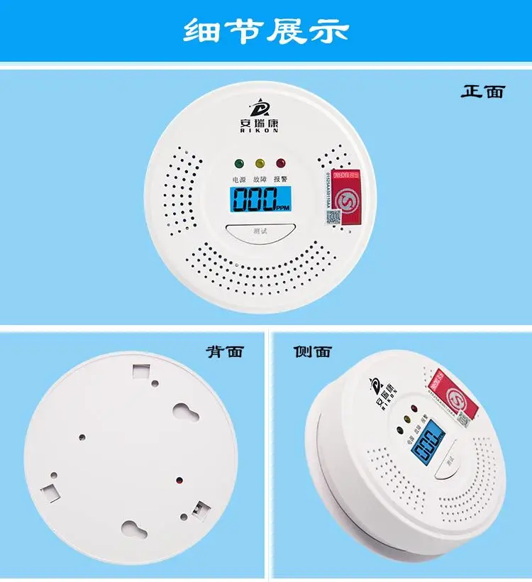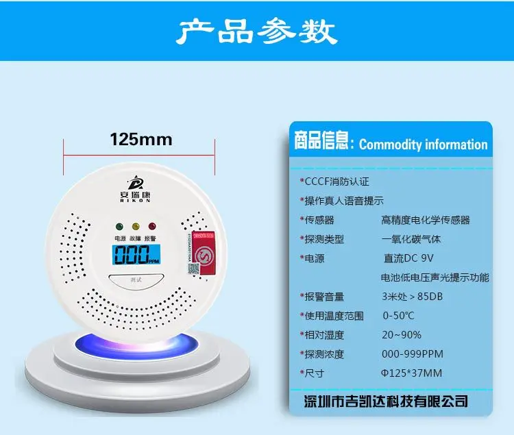 Model: SKD-610; Power supply: 3*1.5V AA (powered by AA battery); Sensor: electrochemical carbon monoxide sensor; Working temperature: 0-50℃; Working humidity: relative humidity 20-95%R.H without condensation; Detection concentration: 000~999PPM; Sensitivity level: 5PPM; Error: +/-10%; Reading during normal work: 000PPM; Concentration reading when alarming: 030-999PPM; Size: diameter 112MM high 34MM