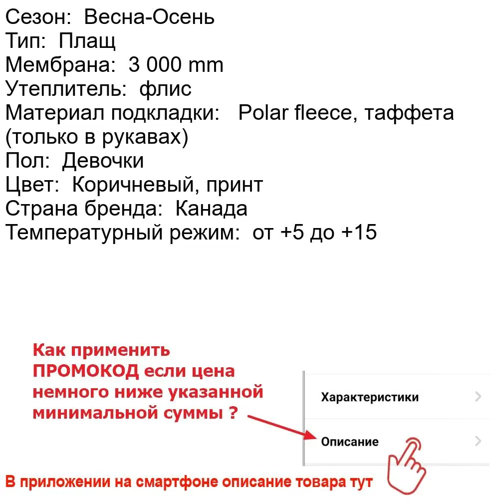 Внимание: если сомневаетесь в выборе правильного размера, то пожалуйста свяжитесь с магазином до заказа (по ссылке «Написать» или «Связаться с продавцом»)СезонВесна-ОсеньТипПлащМембрана3 000 mmУтеплительфлисМатериал подкладки Polar fleece, таффета (только в рукавах)ПолДевочкиЦветКоричневый, принт Страна брендаКанадаТемпературный режимот +5 до +15