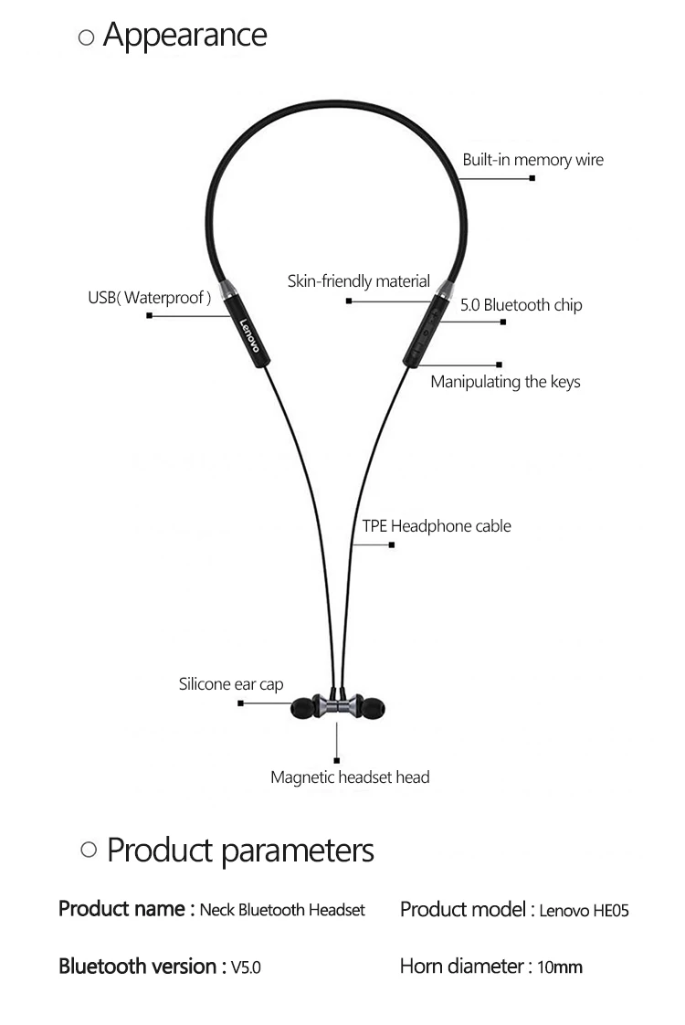 1. Оснащен 8 мм драйвером, он может обеспечить удивительный звук и принести приятный опыт прослушивания. 2. Встроенный аккумулятор большой емкости, рабочее время до 12 часов, время работы в режиме ожидания до 7 дней. 3. Используйте чип Bluetooth 5,0 для обеспечения стабильного и быстрого подключения. 4. Водонепроницаемость IPX5 защищает от дождя и пота-эргономичные наушники могут поддерживать длительный комфорт. 5. Микрофон с шумоподавлением CVC 6. Бренд: Lenovo 7. Модель: HE05 8. Версия BT: 5,0 9. Материал: металл, силикон, ТПЭ 10. Расстояние передачи: 10 м (доступно) 11. Водонепроницаемость: IPX5 12. Пылезащитный: IP6X 13. Батарея: 3,7 V / 105 мА/ч, 14. Время работы: около 8 часов 15. Время работы в режиме ожидания: около 120 часов 16. Время зарядки: около 2 часов 17. Цвет: черный, красный, белый (опционально) 18. Диаметр динамика: 10 мм 19. Чувствительность динамика: 98 дБ 20. Частотный диапазон отклика: 20-20 кГц