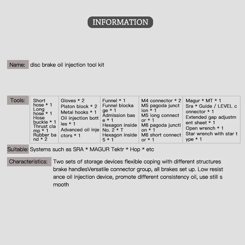 Короткий шланг * 1, длинный шланг * 1, Пряжка для шланга * 1, зажим для проверки * 1, Резиновая лента * 2, перчатки * 2, стоп поршня * 2, металлический крючок * 1, бутылка для наполнения маслом * 1, передовая масленка * 1, воронка * 1, штепсельная вилка воронки * 1, База для хранения * 1, 2 шестигранных гнезда * 1, No. 5 шестигранных гнезд * 1, M4 шарнир * 2, M5 пагода соединение * 1, M5 длинное соединение * 1, M6 пагода соединение * 1, M6 короткое соединение * 1, шарнир magur * MT * 1, SRA * направляющий/уровневый шарнир * 1, расширенная версия регулировки зазора * 1, 7-8 мм открытый гаечный ключ * 1, t10-t15 Звездный ключ * 1