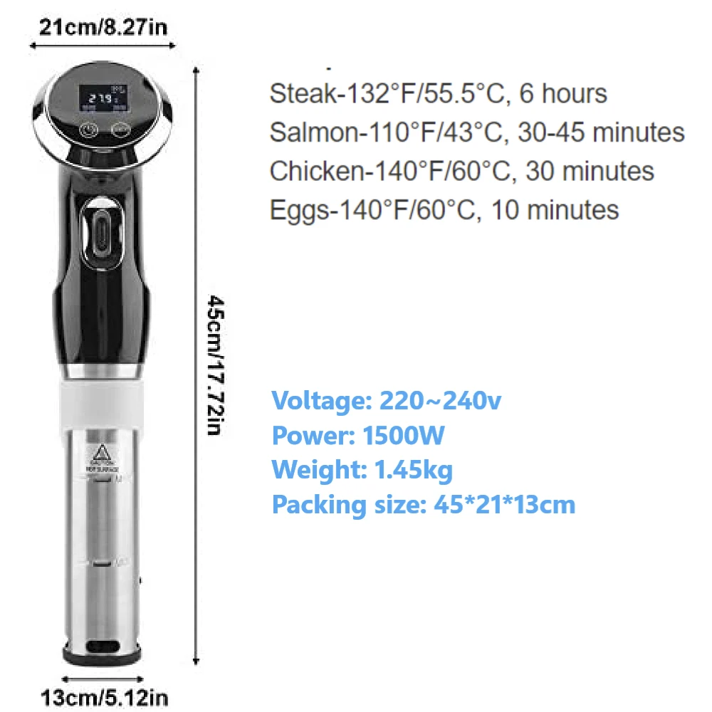 Характеристика Циркуляционный насос: 10 л Макс. Быстрый нагрев циркулятора-при 1500 Вт, sous vide нагревает воду быстро, быстрее получить температуру. Этот сохраняет ровную и стабильную температуру, помогает готовить еду при определенной температуре. И улучшенный циркулятор также может обрабатывать гораздо большие водяные ванны, чтобы позволить приготовлению большего количества пищи за один раз. Функция задержки запуска, простота в использовании-простая две кнопки, одна ручка, проста в использовании. Вы можете установить таймер, чтобы задержать начало приготовления в 4 в течение 2 часов, а ужин почти готов к 6 вечера, когда вы вернетесь домой. Просто колесо прокрутки, чтобы увеличить или уменьшить количество на экране, легко освоить и использовать. Надежная и тихая работа-использовать его, просто положить deice в любой горшок и заполнить водой. Есть большой зажим на спине для горшка, чтобы убедиться, что он не выпадает. Важные функции безопасности включают Предупреждение о низком уровне воды (отключается, когда вода слишком мала, чтобы предотвратить сжигание устройства). И это очень тихо при использовании, не будет беспокоить спящего ребенка. Обеспечение безопасности: 1. Защита от перегрева двигателя. 2. Он автоматически отключится, когда уровень воды будет ниже минимального значения. 3. Он не работает, когда вода ниже минимальной отметки или выше максимальной отметки. Домашний шеф-повар-sous vide для вашей игры на кухне Этот способ приготовления пищи позволит создать самые удивительные и меняющие жизнь стейки, курицу, рыбу, овощи и практически все, что вы бросите в него. Самая большая особенность этого заключается в том, что еда варится в соках. Они оказались идеально средне-розовыми, стейк приходит нашим нежным и ароматным. Позволяет каждому готовить качественную еду в ресторане дома. С помощью шаги: Шаг 1: запечатайте еду в вакуумном пакете и поместите в ванну с водой. Шаг 2: Нажмите кнопку ВКЛ в течение 3 секунд, а затем она выцветает, и дисплей включится. На дисплее будет отображаться текущая температура. Шаг 3: Установите таймер для задержки начала приготовления. Или нажмите кнопку set снова, чтобы установить фактическое время приготовления, называемое «Время работы» на этом блоке (который начинает отсчет только после того, как вода достигнет правильной температуры) Шаг 4: установите температуру/таймер с помощью черного колеса прокрутки спереди. Последний шаг: Когда пища достигает целевой температуры и времени, вынимайте его и обслуживайте.Недавно пришел заказ с этим телефоном из Владивостока. Хочу сказать, что это не телефон, а отменное дерьмо . Как только... Читать отзыв полностью...