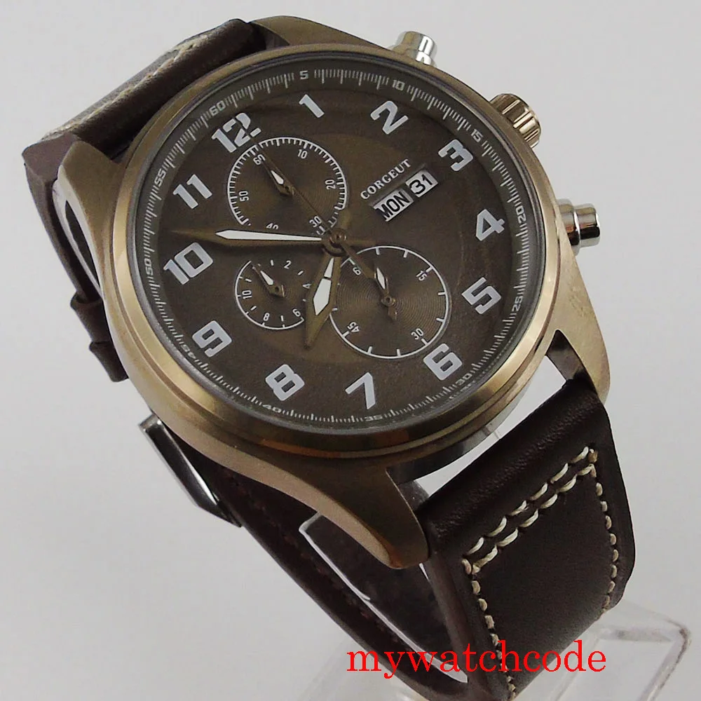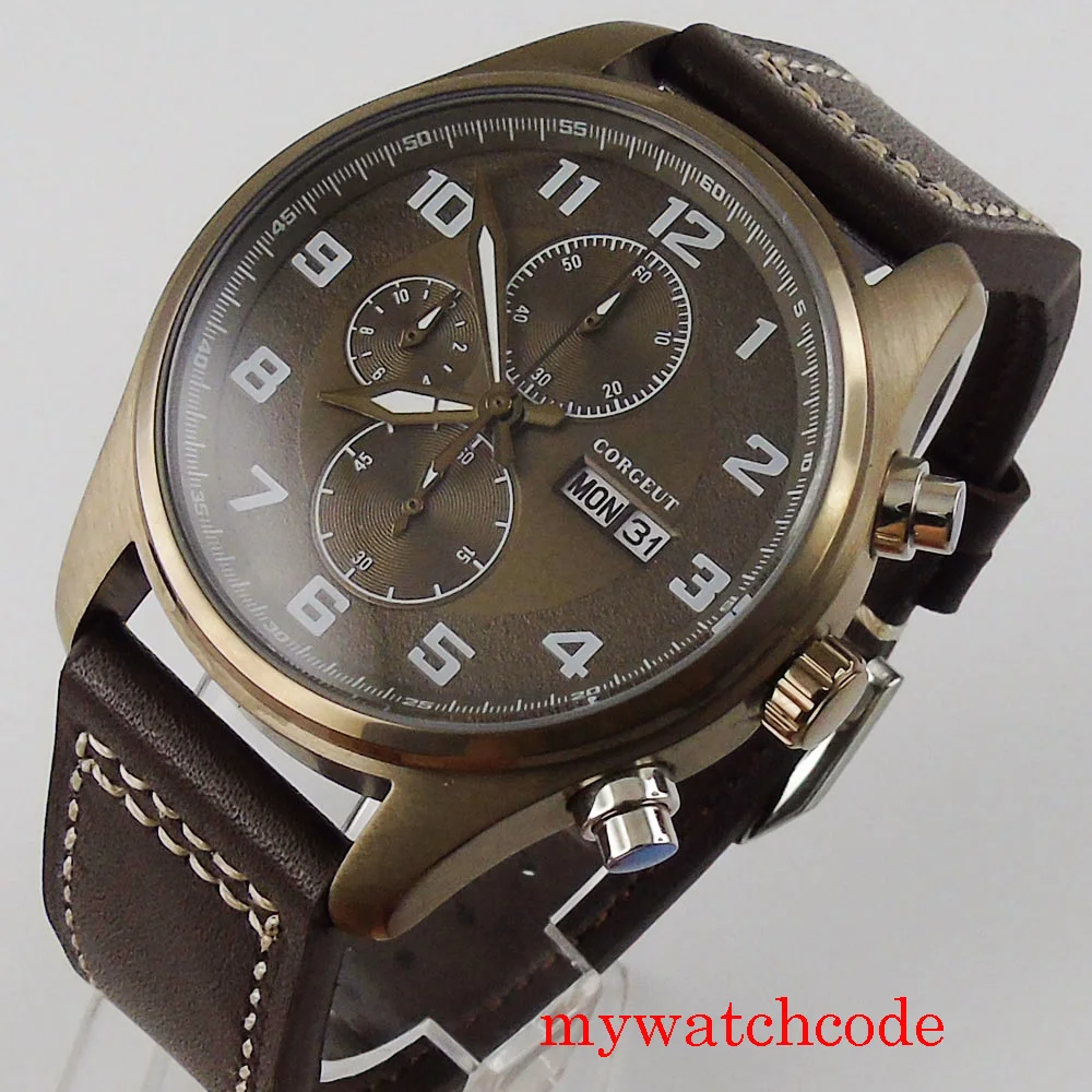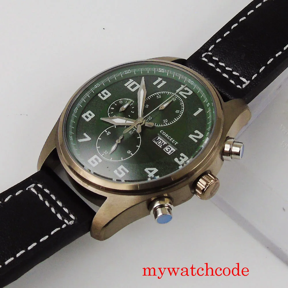Description: >Movement: quartz movement >Dial: green/coffee dial >Case Meterial: solid bronzed plated 316L stainless steel case. >Case diameter: 42mm without crown >Case thickness:13mm >Strap: 20mm width leather strap >Clasp type: pin buckle >Glass: special scratch proof mineral glass >Function: Pusher button at 2:00 Starts/stops chronograph Pusher button at 4:00 resets chronograph Chronograph minute at 9:00 o'clock day and date at 3 o'clock second dial at 6 o'clock Chronograph minute at 12 o'clock Chronograph hour at 9 o'cloc Shipping 1. Item will be posted within 1 business days after payment is completed or CLEARED. And we will follow your address ONLY. 2.Delivery time lasts approx. all of our items shiped by hongkong post with track number A) United States: 7-15 business days B) Europe: 10-25 business days. C) Other countries: not more than 20-30 business days received Payment We accept the payment methods provided by AliExpress Escrow Contact US we will provide the FULL Refund or Exchange service. Only for the faulty items. Please contact us to refund or exchange within 14 days after you receive the item. We strive for positive feedback on all transactions and POSITIVE RATING with 5-STAR rating. If for any reason you are not satisfied with your purchase, please contact us before leaving feedback and we will help to resolve any issue for you - Feedback will be left to every buyer who completed the transaction and left positive feedback to us Your satisfaction is our goal, if you have any question,please contact us,we will reply you in 24 hours! Please note : Import duties, taxes and charges are not included in the item price or shipping charges. These charges are the buyer’s responsibility. Please check with your country’s customs office to determine what these additional costs will be prior to bidding/buying. thank you for looking and biding!