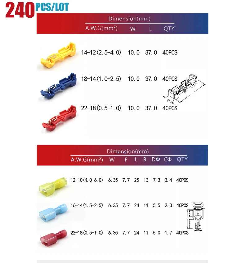 Технические характеристики: Материал: нейлон, медь, олово Диапазон проводов: 22-18 AWG (красный) / 18-14 AWG (синий) / 12 AWG (желтый) Максимальная рабочая температура (Фаренгейт): 221 градусов по Фаренгейту Максимальная рекомендуемая Номинальная мощность напряжения: 600 в Комплектация включает в себя: T-Tap соединитель провода -Красный: AWG 22-18; Диапазон проводов: 0. 5-1. 5mm м² -Синий: AWG 18-14; Диапазон проводов: 1. 5-2. 5mm м² -Желтый: AWG 12; Диапазон проводов: 2. 5-4. 0mm м² Мужской лепестковый разъем -Красный: AWG 22-18; Диапазон проводов: 0. 5-1. 5mm м² -Синий: AWG 18-14; Диапазон проводов: 1. 5-2. 5mm м² -Желтый: AWG 12; Диапазон проводов: 2. 5-4. 0mm м²