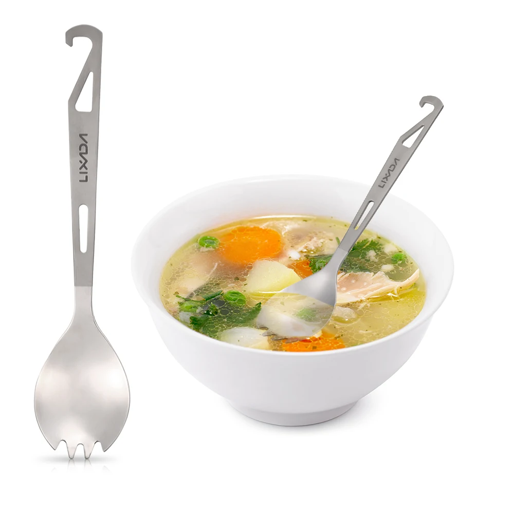 Этот spork объединяет функции вилки, ложки и открывания бутылок. Он изготовлен из titanium, легкий и прочный, отлично подходит для кемпинга, пеших прогулок, альпинизма.
