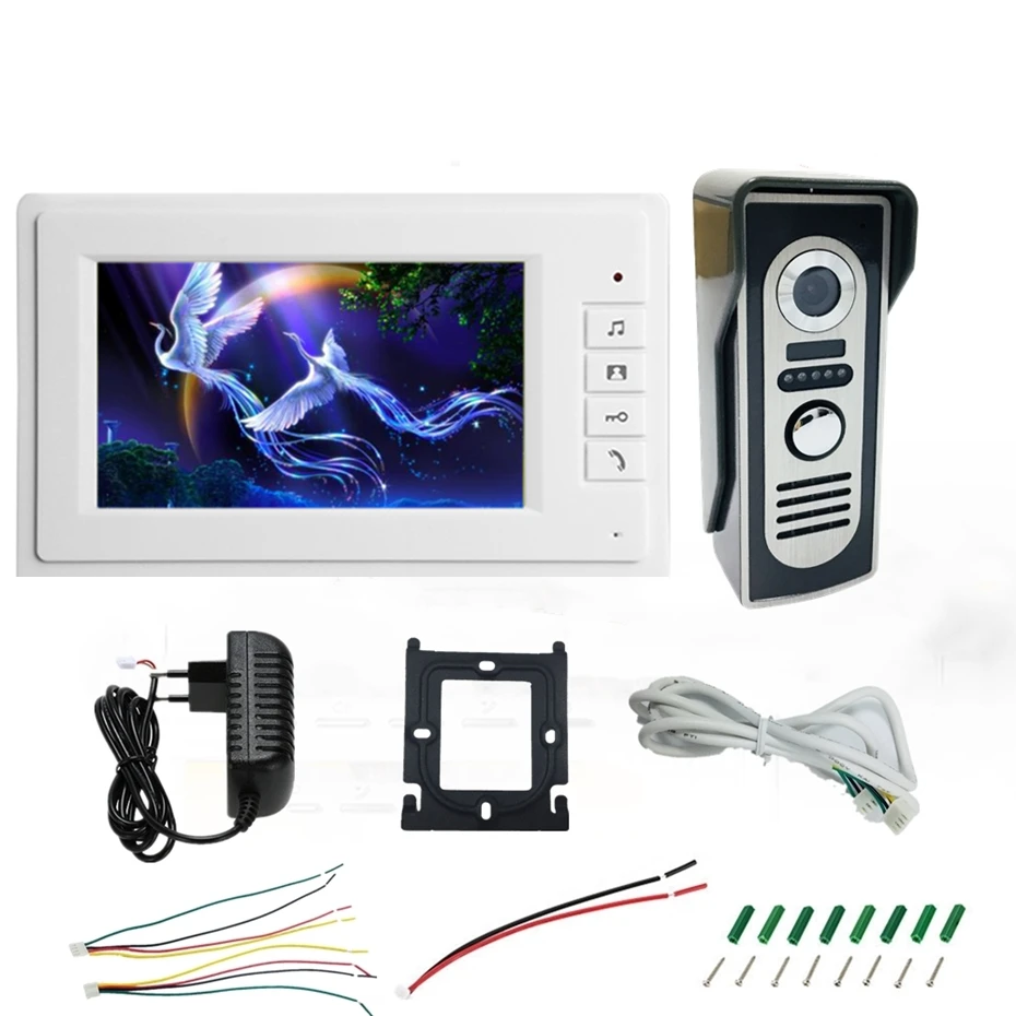 1 шт 7-дюймовый внутренний монитор 1 шт. 1200TVL наружная панель вызова 1 метр соединительный кабель 1 шт. Монтажная пластина для внутреннего монитора 1 шт. адаптер питания 1 сумка аксессуары 2шт 4pin соединительный провод с разъемом 1 шт. 2-контактный соединительный провод с разъемом