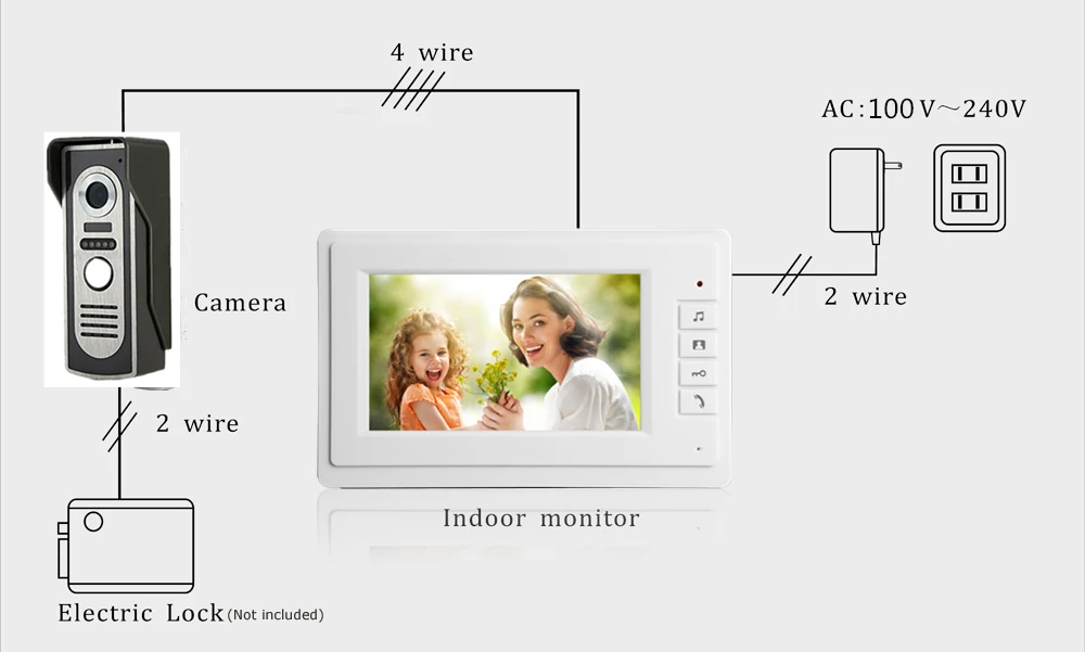 Дисплей: 7 "TFT LCD Разрешение: 800X480 Источник питания: 15 В постоянного тока Задержка разговора: 120S Рабочая температура: -20 ℃-60 ℃ Установка: настенное крепление