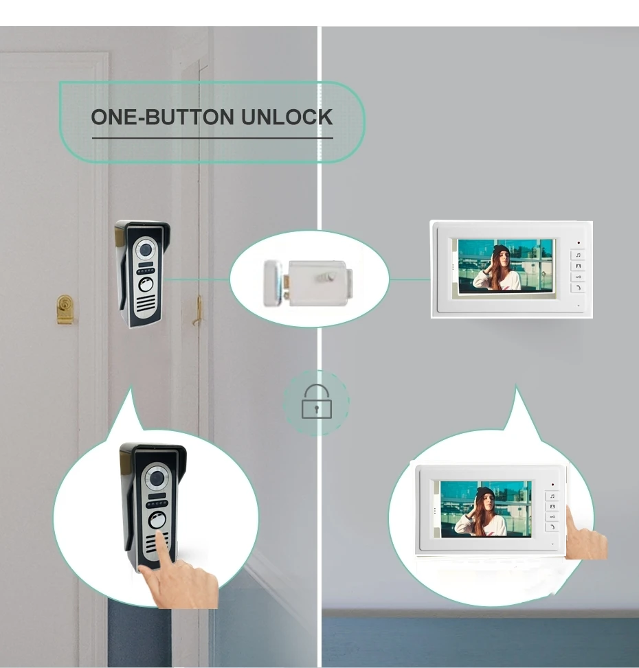 Когда владелец дома хотел бы открыть дверь для посетителей после визуального разговора, ему или ей не придется пробежать к двери, просто удаленно разблокировать его, нажав кнопку разблокировки на внутреннем мониторе.