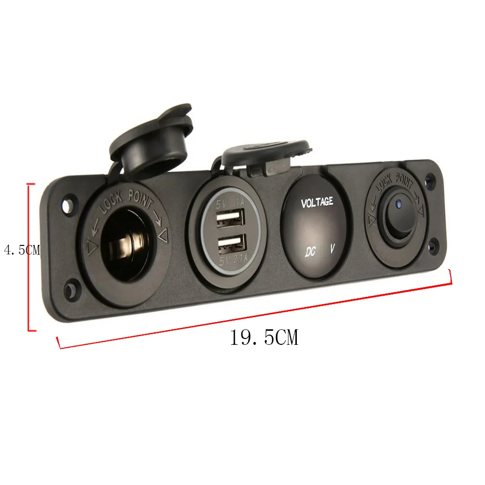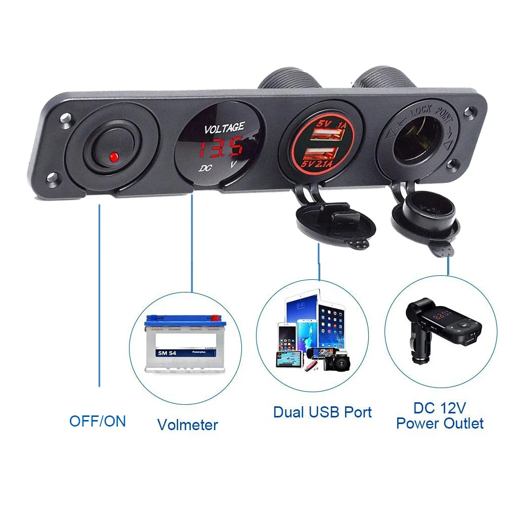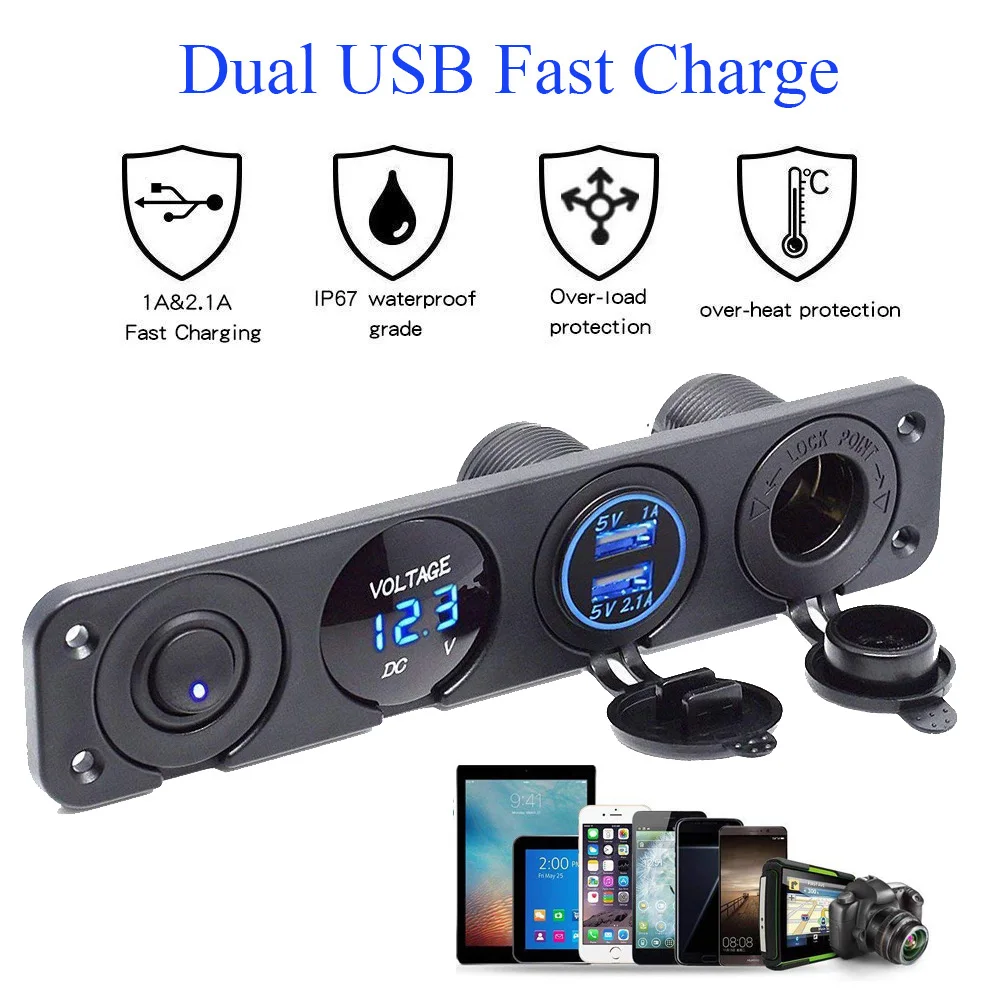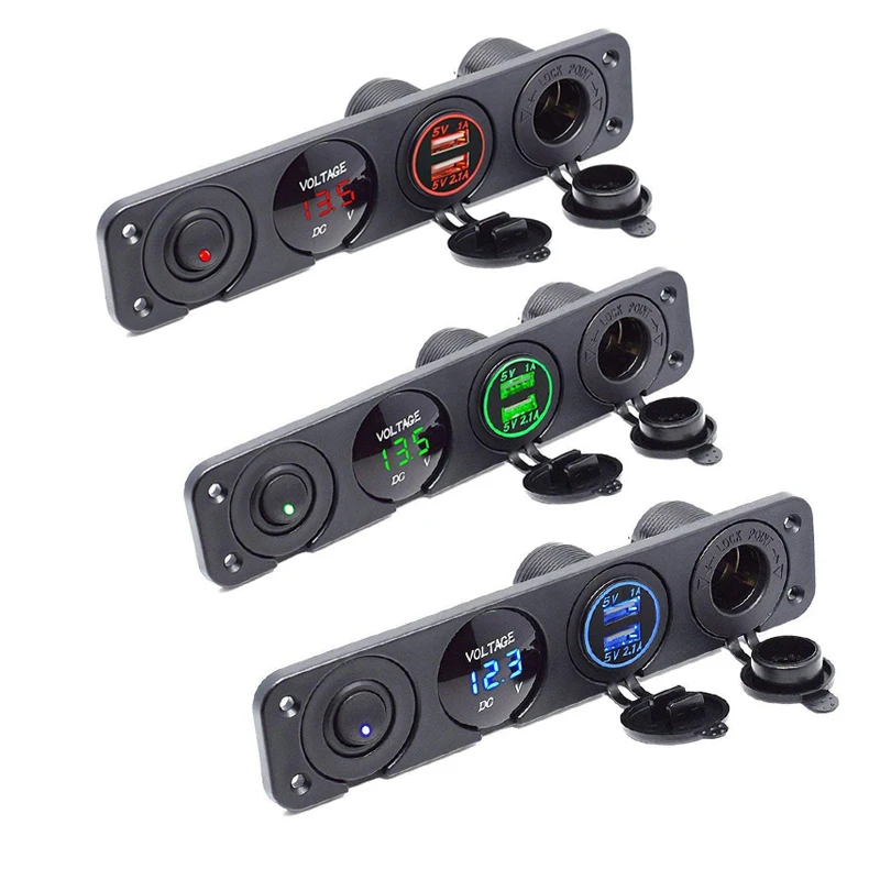 Панель переключателя подходит для лодки, автомобиля, RV, грузовика Светодиодный светильник цвет: красный, синий, зеленый Количество отверстий панели: 4 отверстия USB Зарядное устройство параметры: Рабочее напряжение: 12 В Интерфейс: с 2 портами (стандарт Выход: 5 В/2,1 А, 5 В/1 А Гнездо прикуривателя: Рабочее напряжение: 12 В постоянного тока