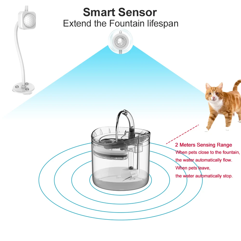Продлите срок службы фонтана. Внешний инфракрасный датчик, дальность срабатывания 2 метра-когда домашние животные находятся близко к фонтану, вода автоматически течет. Когда Домашние животные уходят, вода автоматически останавливается.