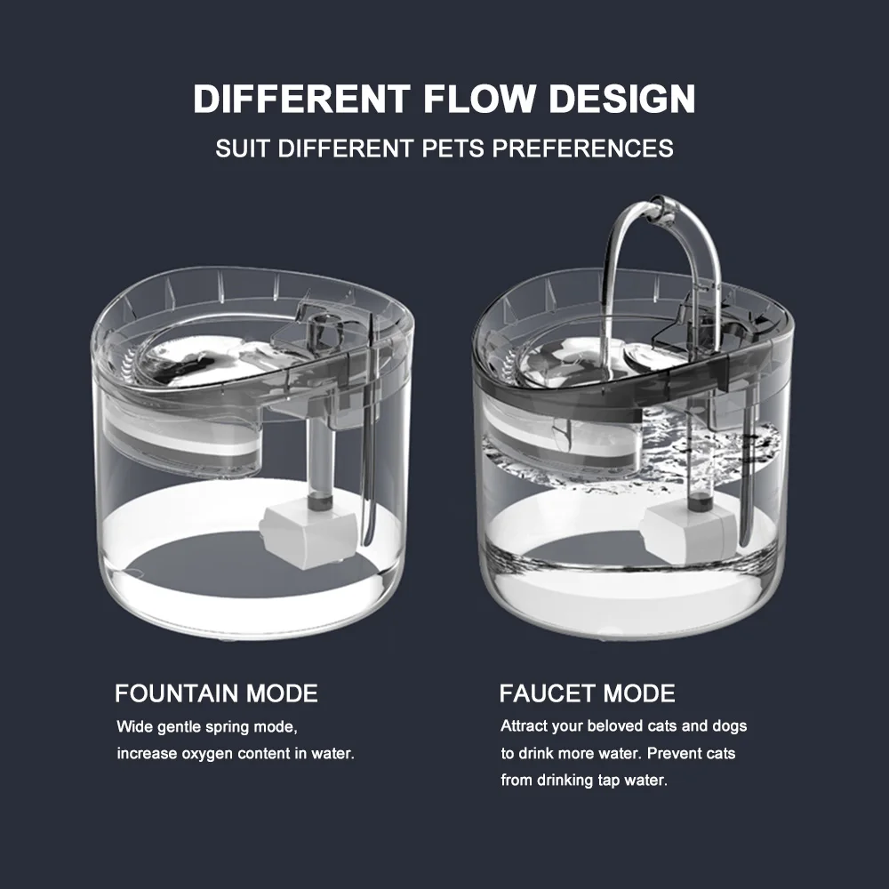 Режим фонтана-широкий мягкий пружинный режим, увеличивающий содержание кислорода в воде. Режим смесителя-как кран, капелька, привлекает ваших любимых кошек и собак, чтобы пить больше воды. Не позволяйте кошкам питать водопроводную воду.