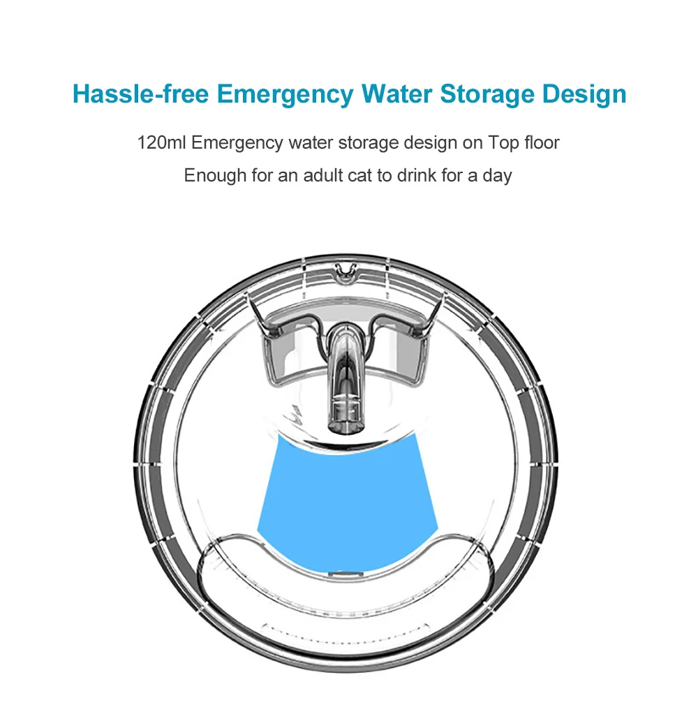 Аварийное хранение воды (120 мл) на верхнем этаже используется для аварийных ситуаций. В случае сбоя питания или другой специальный чехол s, ваши питомцы все еще имеют воду, чтобы пить.