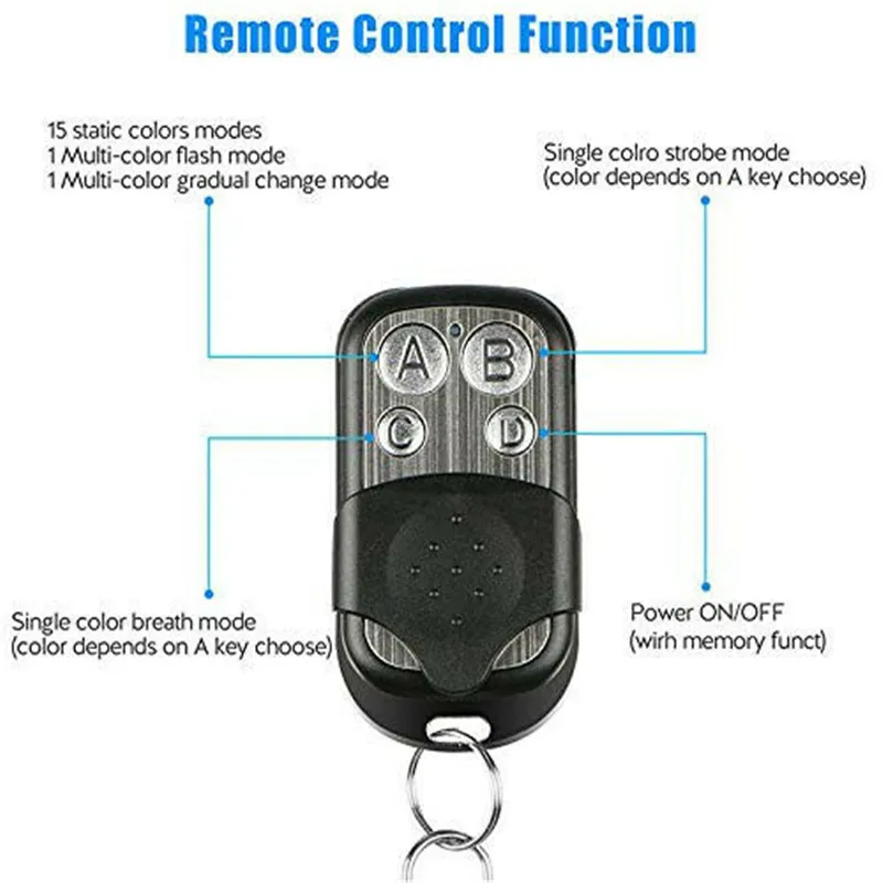 Ключ A: изменение цвета, длительное нажатие может изменить 4 уровня затемнения. Клавиша B: режим вспышки. Нажмите и удерживайте, чтобы относительно увеличить и уменьшить скорость шаблона. Клавиша C: режим затухания. Нажмите и удерживайте, чтобы относительно увеличить и уменьшить скорость шаблона. Клавиша D: короткое нажатие вкл/выкл, длительное нажатие в течение 5 сек сбрасывается.