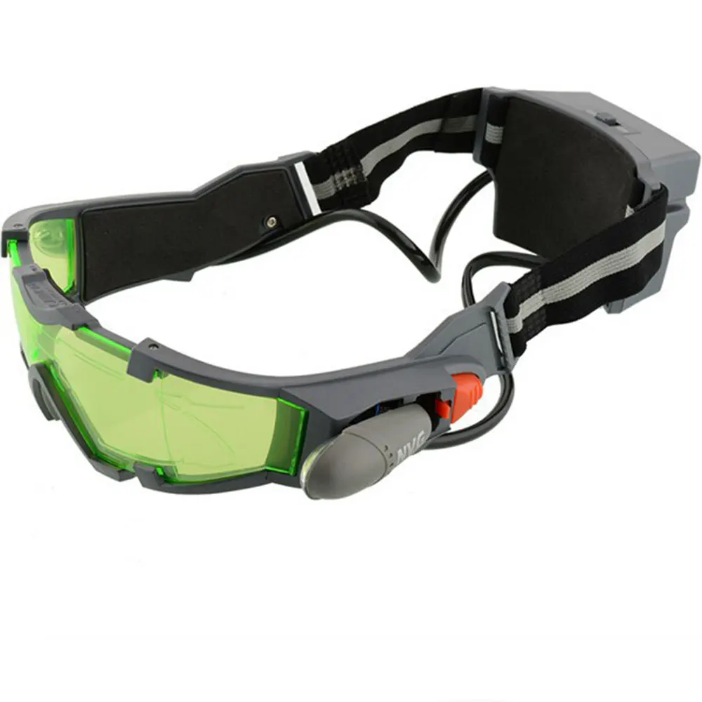 Features: Night vision goggles with flip-out lights. Comfortable nose pad. See in the dark 25 feet. Green tinted lens with etched graphics that glow when lights are on. Pop out lights that beam a blue light in the dark. Adjustable elastic b ands for a comfortable fit. LED lights never need replacing. Suitable for night activities. Specifications: Power: 4x AAA batteries (Not included) Color: Black frame and green lens Light color: Blue Item size:19 x 19 x 6 cm Packing size: 22.8 z 20 x 72cm Net weight: 155g Package included: 1 x Night Vision Goggles