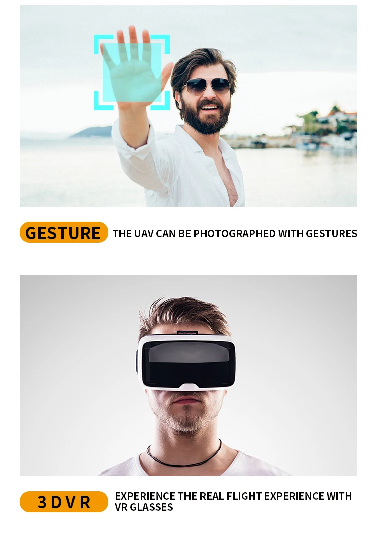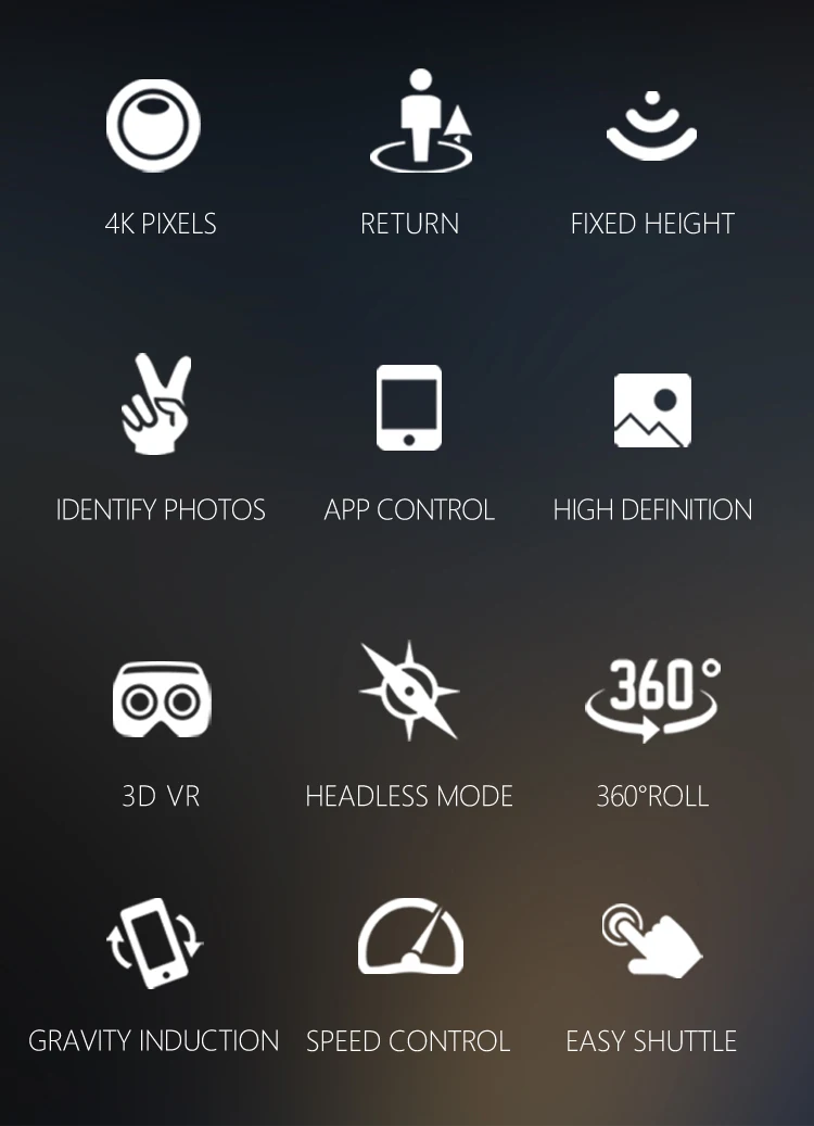 Управление Wi-Fi: передача видео в режиме реального времени путем сопряжения мобильных приложений с Беспилотным Wifi Одним нажатием кнопки Взлет/посадка: сделать работу более удобной. Функция автоматического возврата одной кнопкой: самолет может легко найти путь домой. Широкоугольная камера: записывает и записывает каждый красивый и запоминающийся момент. Обслуживание по высоте: обеспечивает удобную работу и стабильный полет для начинающих. Безголовый режим: полностью решить проблему смещения пилота. Запись фото жестов: камера автоматически распознает жесты для съемки фотографий или видео. Контроль скорости: 3 скорости, низкий/средний/Быстрый Функции: вперед/назад, вверх/вниз, влево/вправо полет, поворот влево/вправо, наведите курсор, одна кнопка взлета/посадки, Безголовый режим, обслуживание высоты, возврат одной кнопкой, Wi-Fi управление фото/видео, поворот на 360 °