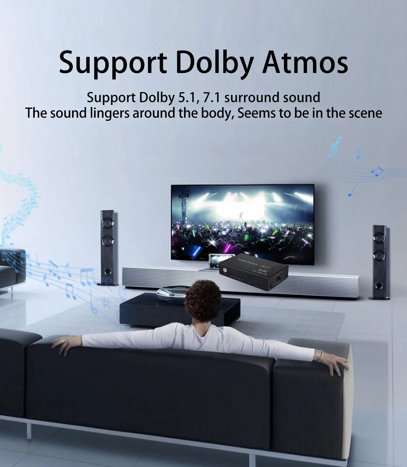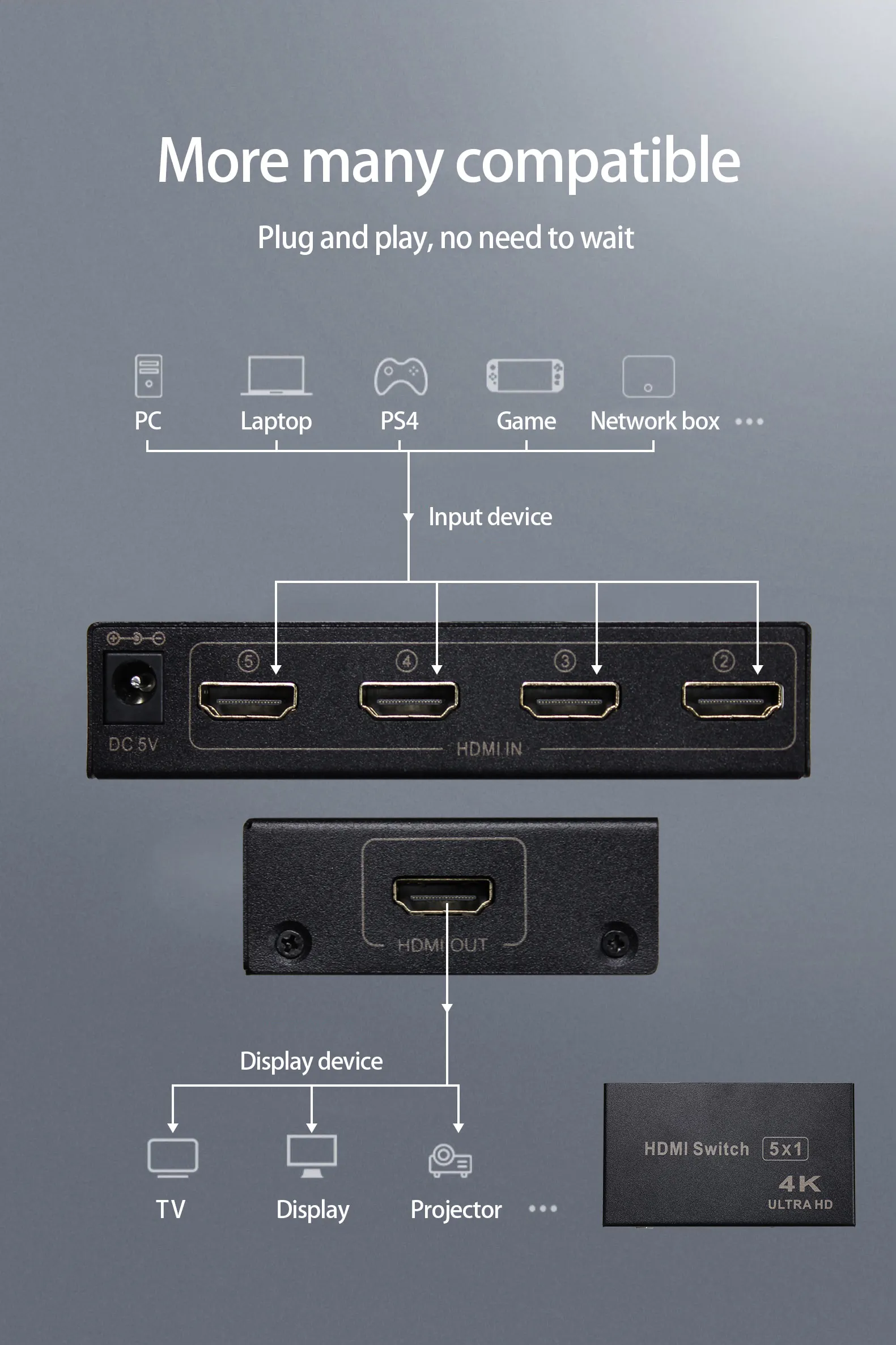 5 портов 4k HDR HDMl переключатель работает со всеми HDMl-интегрированными устройствами, такими как HD-DVD, Sky-HD, STVP, S3/4/4 PRO, X-BOX One, DVD/Blu-Ray DVD, ПК/ноутбук, MacBook, STB, Roku TV/Fire TV/другие устройства Apple и Sony с портом HDMl.