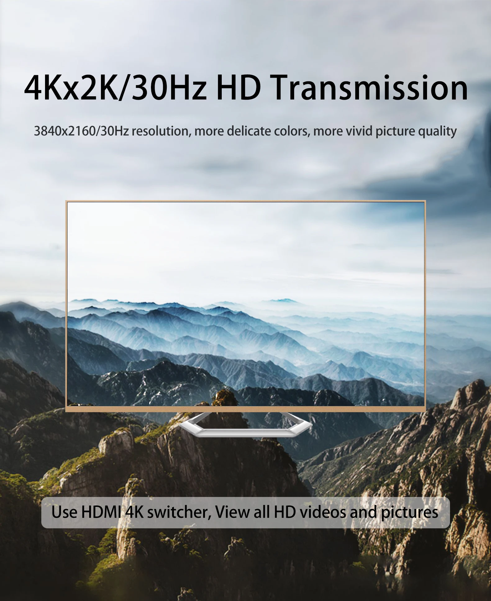 Переключатель монитора поддерживает разрешение до 4K @ 60 Гц, включая Full HD 3D, 1080P. Задняя часть совместима с 4k @ 30Hz и 1080P. HDMl сквозной переключатель поддерживает HDCP 2,2, а также HDCP 1,4