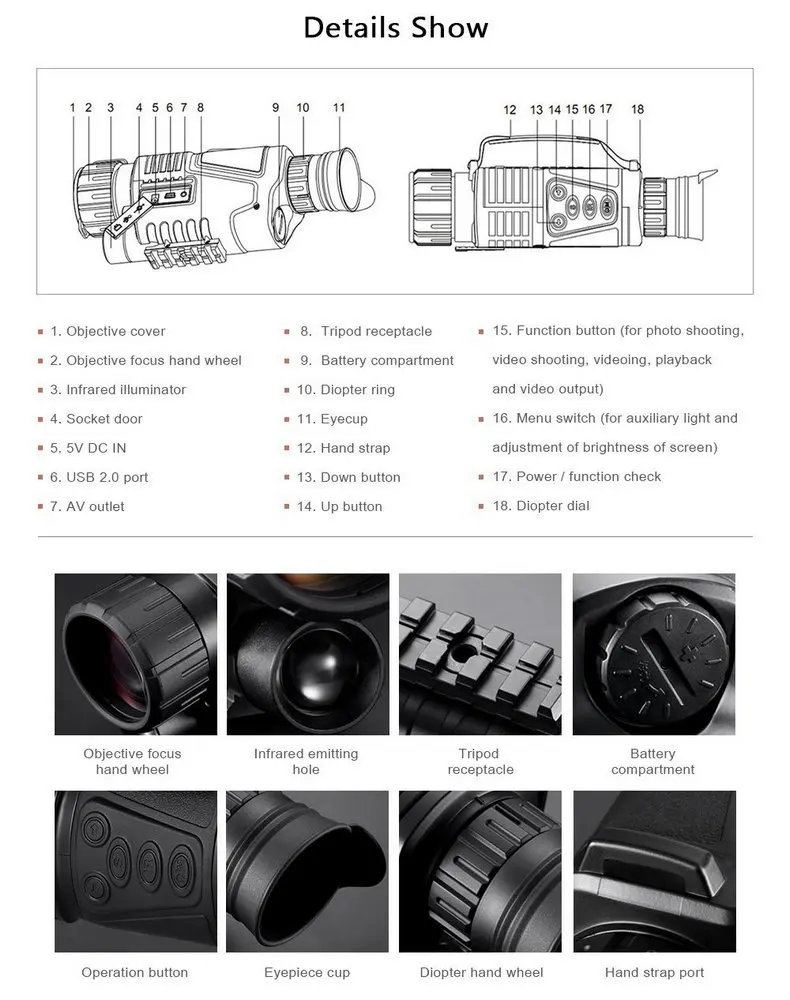 -Функции: дневное и ночное видение, фотографирование, запись и воспроизведение и т. Д.