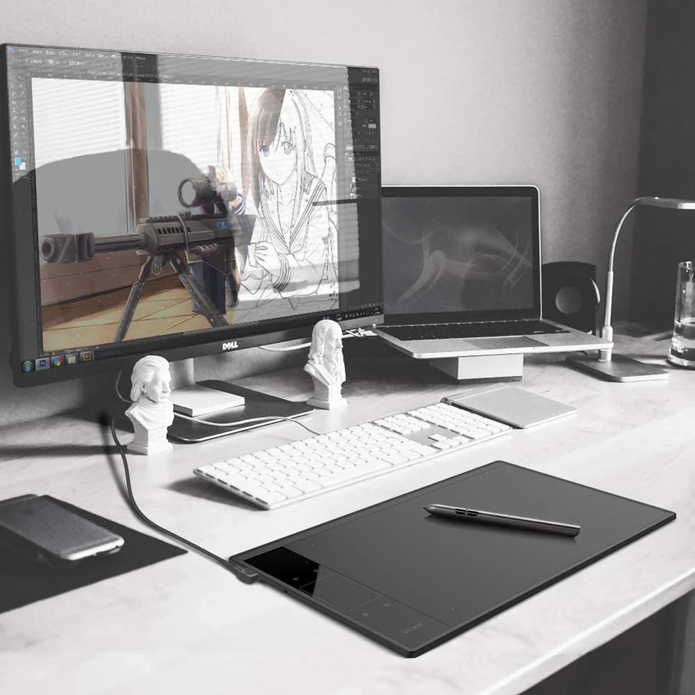 Smart Gesture Touch и 4 настраиваемых сенсорных ключа: этот графический планшет имеет умную жестовую панель, которая может сделать вашу работу легко для увеличения и уменьшения, отмены/переделки и т. Д. Сенсорная панель и 4 сенсорных клавиши могут быть настроены в соответствии с вашими привычками использования.
