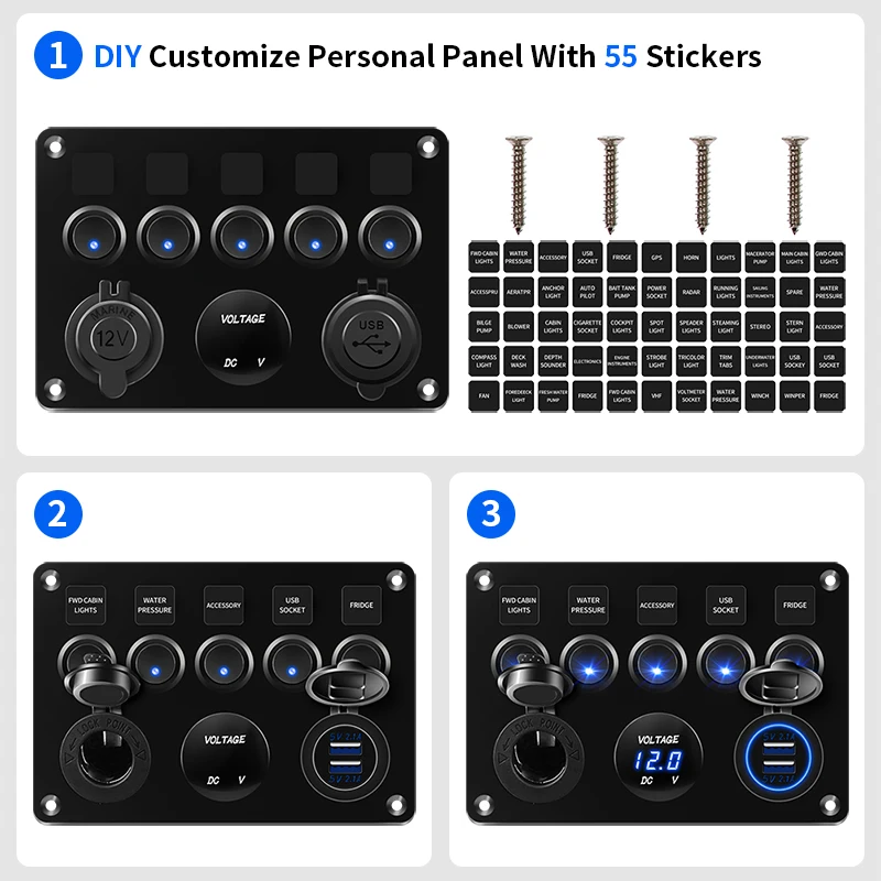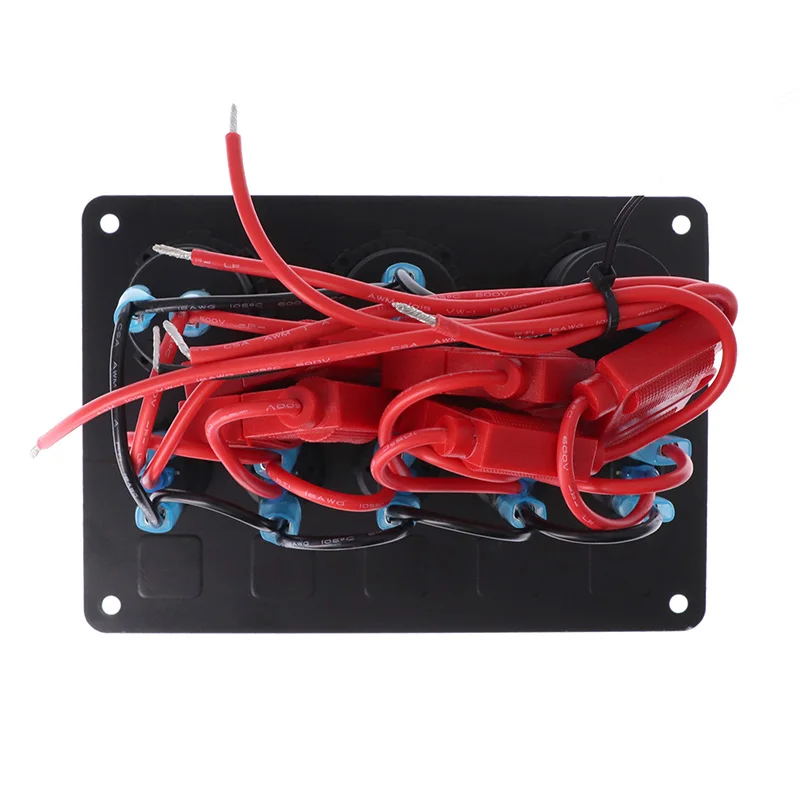 (1) многофункциональная Панель; Двойная usb-розетка + Вольтметр + розетка 12 В + 5 переключателей (2)5 светодиодный переключателей имеют защиту от перегрузки, перегрузки по току и короткого замыкания. (3) панель переключателя подходит для универсальных автомобилей, лодок, грузовиков