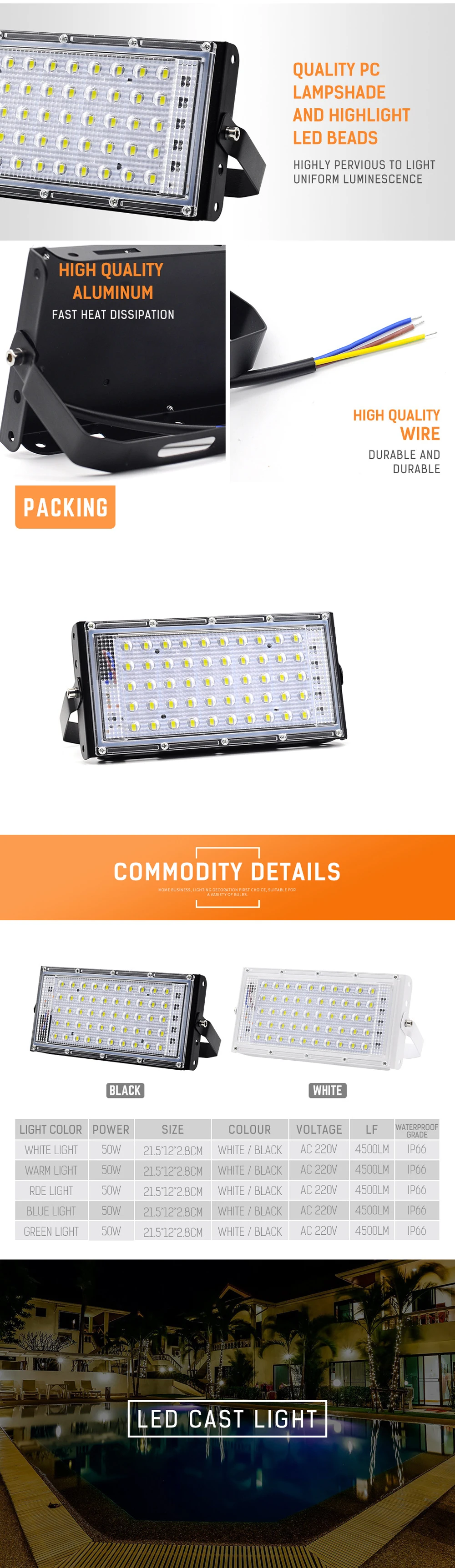 ►Мощность: 50 Вт ►Напряжение: AC220-240V ►Модель светодиодного чипа: SMD2835 ►Индекс цветопередачи: >Ra85 ►Люмен: 5000лм ►Цветовая температура: холодный белый 6000-6500K/теплый белый 2700-3500K ►Срок службы: >50 000 часов ►Материал корпуса: алюминий ►FACTS: наш продукт построен с чипами высокого качества. Высокое качество ABS абажур твердый высокий коэффициент пропускания. Наш светодиодный светильник эквивалентен 300 Вт галогенной лампе. Прожектор также экономит 80% вашей энергии по сравнению с традиционными галогенными лампами. Осветите вашу атмосферу нашим светодиодный прожектором! Современный дизайн: тонкий дизайн помогает увеличить контакт воздуха вокруг области. Он замедляет рассеивание тепла, не создавая каких-либо рисков безопасности. Светодиодный отражатель с заземляющим проводом и рабочим напряжением (AC 220V AC 230V AC 240V ). Он также имеет угол луча 180 градусов. Он также имеет угол луча 180 градусов. • Водонепроницаемость: наш продукт является водонепроницаемым Ip66. Это может быть идеально подходит для использования в помещении и на открытом воздухе. (Мы рекомендуем Вам Не погружать его в воду.) Применение: наши светодиодные прожекторы могут использоваться на дорогах, садах, мостах, билбордах, улицах, парках, деревьях, гостиницах, жилых украшениях и многого другого! ► Гарантия качества: Наш продукт проходит сертификацию CE, мы предоставляем 24-месячную ограниченную гарантию на продукт.