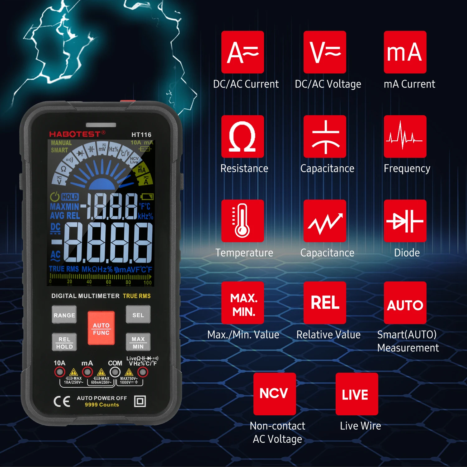 Полнофункциональный мультиметр: профессиональный мультиметр имеет различные полезные функции s для измерения напряжения постоянного/переменного тока, постоянного/переменного тока, сопротивления, емкости, частоты/нагрузки, температуры и диода, проверка непрерывности, Бесконтактное Обнаружение напряжения переменного тока, обнаружение живого провода.