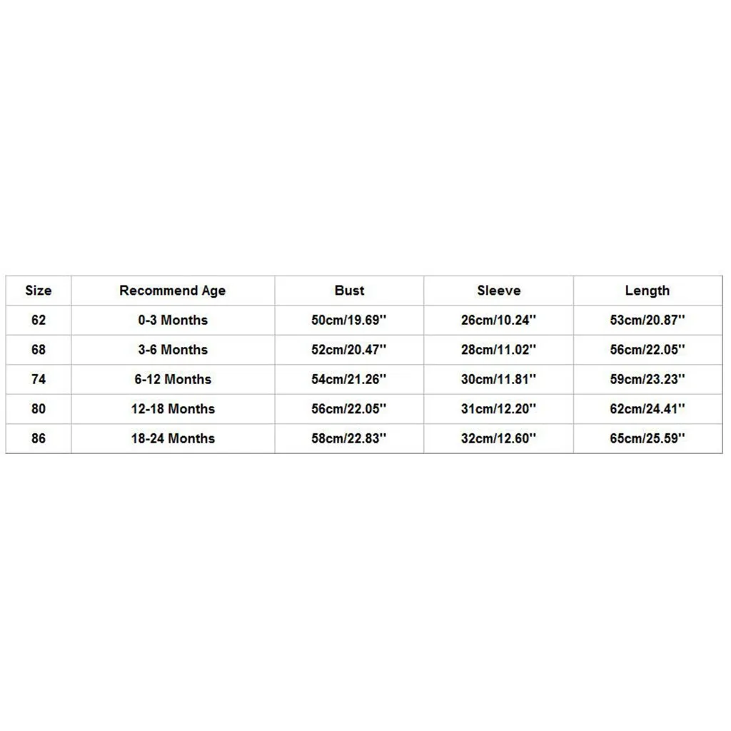 Размер Рекомендуемый возраст Бюст Рукав Длина 62 0-3 месяца 50 см/19,69'' 26 см/10,24'' 53 см/20,87'' 68 3-6 месяцев 52 см/20,47'' 28 см/11,02'' 56 см/22,05'' 74 6-12 месяцев 54 см/21,26'' 30 см/11,81'' 59 см/23,23'' 80 12-18 месяцев 56 см/22,05'' 31 см/12,20'' 62 см/24,41'' 86 18-24 месяцев 58 см/22,83'' 32 см/12,60'' 65 см/25,59''
