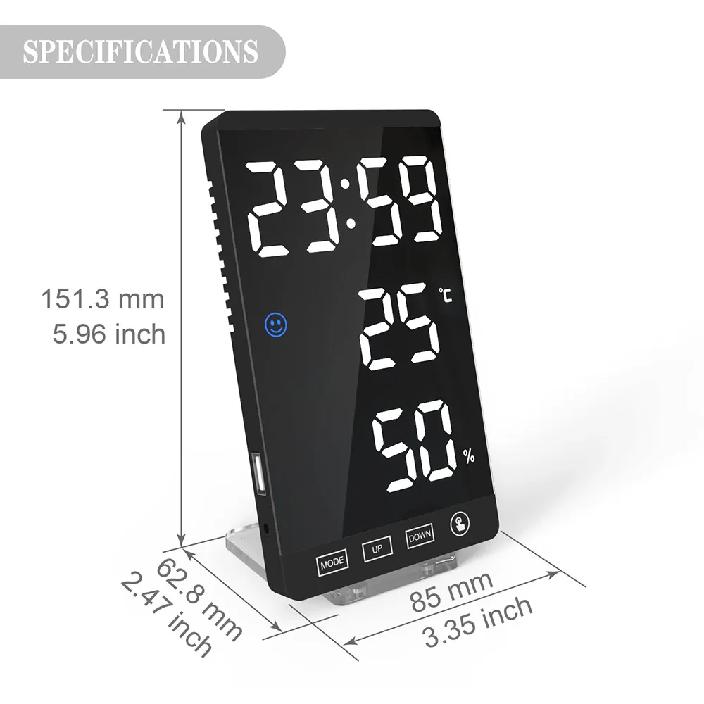 Зеркальные погодные часы могут четко показать вам время (формат 12/24 часов), данные о температуре (-20 ℃ ~ 70 ℃, -4 ℉ ~ 157 ℉) И данные о влажности (20% ~ 95%) в режиме реального времени, давая данные о yoution для поддержания здоровья жизни. Удобная икона лица (синий комфорт, зеленый знать интерьер умеренность, красный некомфортность) может показать Вам комфортный уровень непосредственно