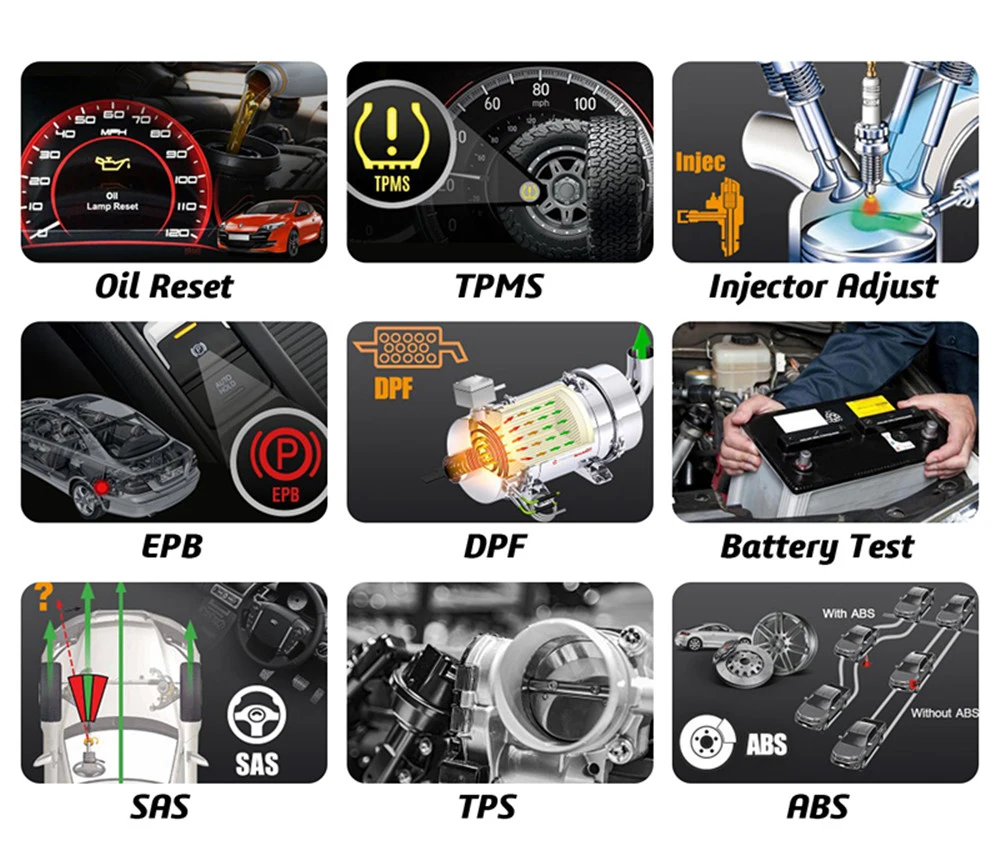 Сброс масла: позволяет выполнить сброс технического обслуживания пробега и интервалов данных для нового расчета системы жизнедеятельности моторного масла после изменения масла. Сброс TPMS: позволяет сенсору TPMS отображать идентификаторы датчиков из Эбу транспортного средства, вводить идентификационные номера датчика TPMS и активировать датчики TPMS. Регулировка инжектора: код дизельного инжектора требует идентификатора программирования и параметров в ECU для точной связи и системы контроля впрыска Сброс EPB: важно в обслуживании безопасности и эффективности электронной тормозной системы при замене тормозных колодок или двигателя DPF: специально работает для дизельной системы фильтров твердых частиц с регенерацией DPF, DPF компонент замены обучения и DPF после замены блока управления двигателем. TPS/датчик дроссельной заслонки: Датчик положения дроссельной заслонки транспортного средства подключен к шпинделю бабочки и в основном используется для контроля положения дроссельной заслонки в двигателе внутреннего сгорания. Из-за его расположения Датчик положения дроссельной заслонки способен эффективно наблюдать, где расположен Дроссельный клапан. Кровотечение ABS: Автоматическая процедура кровотечения используется на оборудованных автомобилях BOSH 5,3. Эта процедура использует инструмент сканирования для цикла системы соленоидных клапанов и запуска насоса, чтобы очистить воздух от вторичных цепей. Сброс SAS: помогает очистить воспоминания датчика угла поворота и играет важную роль в калибровке датчика угла поворота руля. Изменение батареи: позволяет сканировать устройство для оценки состояния заряда батареи, контролировать ток замыкания, зарегистрировать замену нового аккумулятора и активировать остальное состояние системы аккумуляторной батареи транспортного средства Летучая мышь: Замена батареи Позволяет вам проверить новые батареи, как очистить ошибки от приборной панели и дисплея.