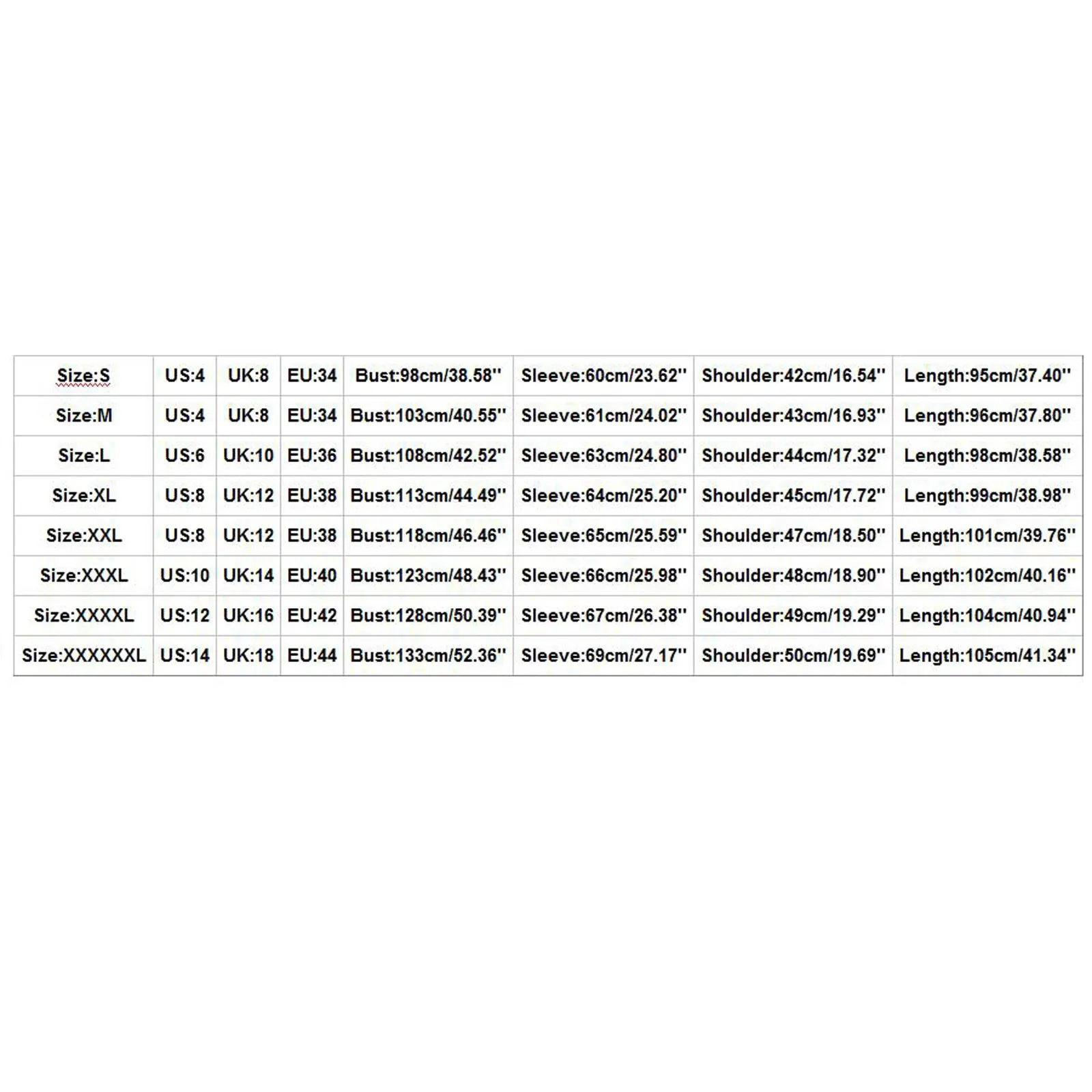 Размеры США Великобритания ЕС Бюст Рукав Плечо Длина S 4 8 34 98 см/38,58 дюйма 60 см/23,62 дюйма 42 см/16,54 дюйма 95 см/37,40 дюйма М 4 8 34 103 см/40,55 дюйма 61 см/24,02 дюйма 43 см/16,93 дюйма 96 см/37,80 дюйма L 6 10 36 108 см/42,52 дюйма 63 см/24,80 дюйма 44 см/17,32 дюйма 98 см/38,58 дюйма XL 8 12 38 113 см/44,49 дюйма 64 см/25,20 дюйма 45 см/17,72 дюйма 99 см/38,98 дюйма XXL 8 12 38 118 см/46,46 дюйма 65 см/25,59 дюйма 47 см/18,50 дюйма 101 см/39,76 дюйма XХХL 10 14 40 123 см/48,43 дюйма 66 см/25,98 дюйма 48 см/18,90 дюйма 102 см/40,16 дюйма XXXXL 12 16 дюймов 42 128 см/50,39 дюйма 67 см/26,38 дюйма 49 см/19,29 дюйма 104 см/40,94 дюйма XXXXXXL 14 18 44 133 см/52,36 дюйма 69 см/27,17 дюйма 50 см/19,69 дюйма 105 см/41,34 дюйма
