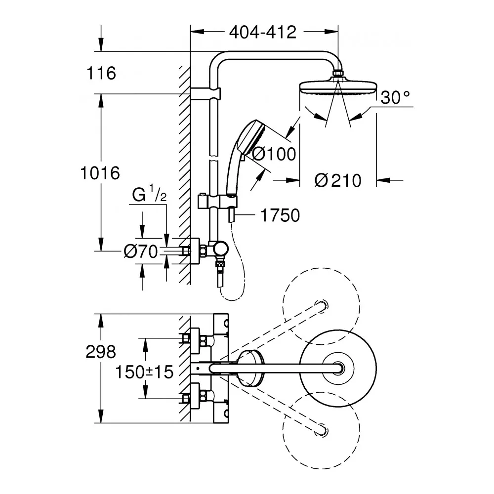 Дополнительная информация: Душевая система Grohe с термостатом: идеальный выбор, если вы устали от постоянной настройки температуры воды включает в себя: горизонтальный поворотный душевой кронштейн 390 мм настенный термостат с аквадиммером выбор между: head shower Tempesta 210 (26 408) душевая струя Rain с шаровым шарниром угол поворота ± 15° ручной душ New Tempesta Cosmopolitan 100 (27 571 001) 2 вида струй: Rain, Jet регулируется по высоте с помощью скользящего элемента душевой шланг, 1.750 мм 1/2 x 1/2 (28 410) Grohe TurboStat встроенный термоэлемент Grohe SafeStop стопор безопасности при 38°C Grohe SafeStop Plus optional temperature limiter at 43°C included Grohe DreamSpray превосходный поток воды Grohe StarLight хромированная поверхность с системой SpeedClean против известковых отложений Внутренний охлаждающий канал для продолжительного срока службы Twistfree против перекручивания шланга совместим с проточным водонагревателем от 18 kВ/ч минимальный расход
