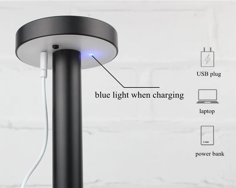 Размер: D 150 x H340 мм Цвет: белый и черный Питание: USB Аккумулятор: литиевый аккумулятор 4400 мАч 18650 Источник светильник: сверхъярсветильник SMD Тип переключателя: кнопочный переключатель, 3 уровня затемнения Цвет светодиодный да: теплый белый для столовой Время зарядки и работы: Время полной зарядки: 5 часов Время непрерывной работы: 8-16 часов Особенности: 1. Отлично подходит для ужина, шнур не нужен. 2. Цельный алюминий с окислительной поверхностью против царапин. 3. Рассеивающий ПММА-абажур и теплый светодиодный Конструкция лампы на 4,360 градусов обеспечивает большую световую зону. 5. Встроенная перезаряжаемая батарея, после полной зарядки лампа используется для более 16 часов. С увеличением циклов зарядки аккумулятора емкость аккумулятора естественным образом уменьшится. 6. Детали посылка: 1. Лампа * 1 ;2. Руководство * 1; 3. Кабель USB * 1. Как использовать: 1. Пожалуйста, полностью зарядите устройство при первом использовании. 2. Синий светильник горит во время зарядки, синий светильник выключается при полной зарядке.