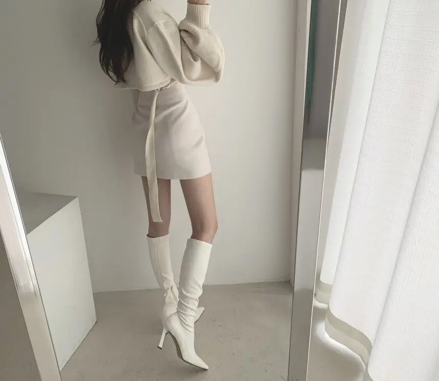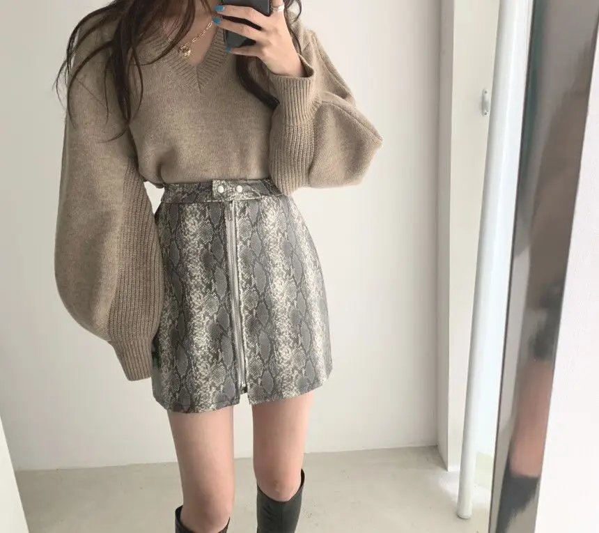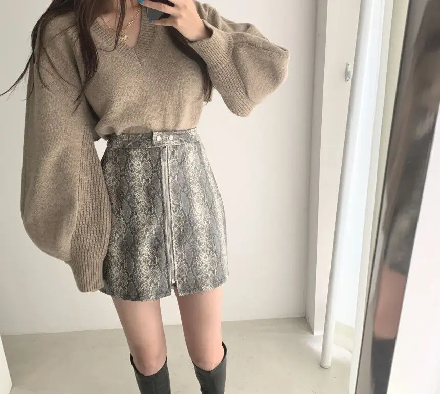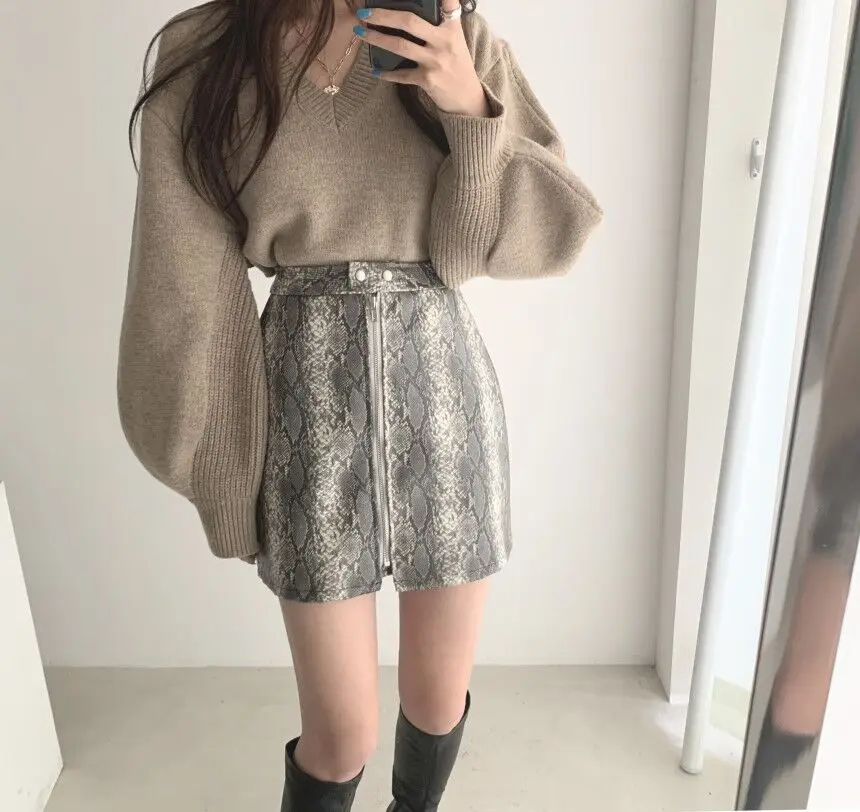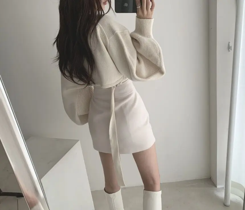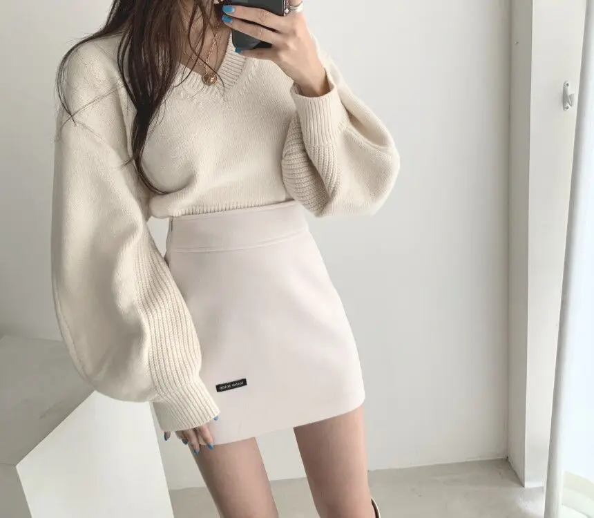 Korean Chic Elegant V-neck Back Lace Up Irregular Lantern Sleeve Knitted Sweater High Waist Bag Hip Woolen Skirt Women Two Piece Set