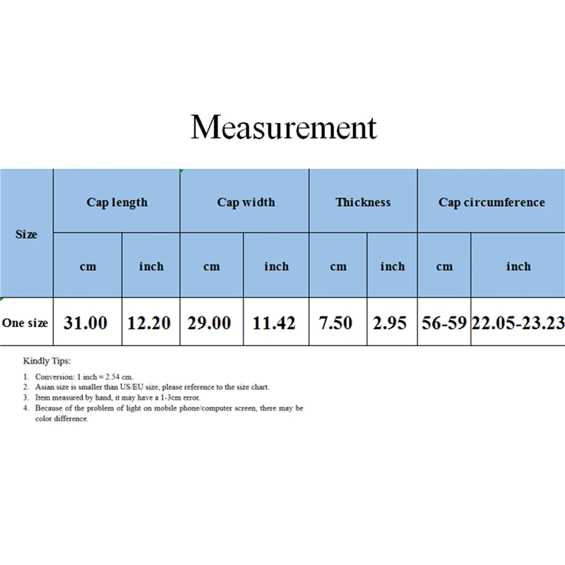 Size Hat Circumference Cap Width ThicknessCap length One Size 56-59cm29cm 7.5cm 31cm