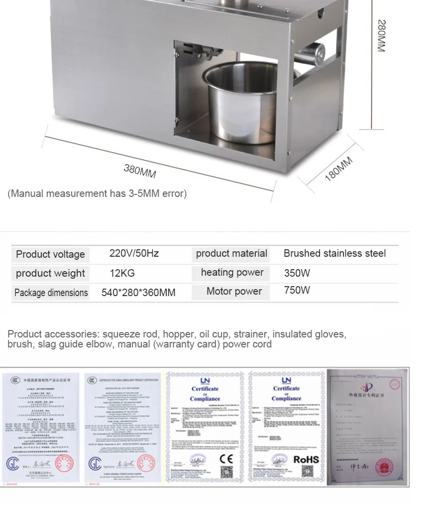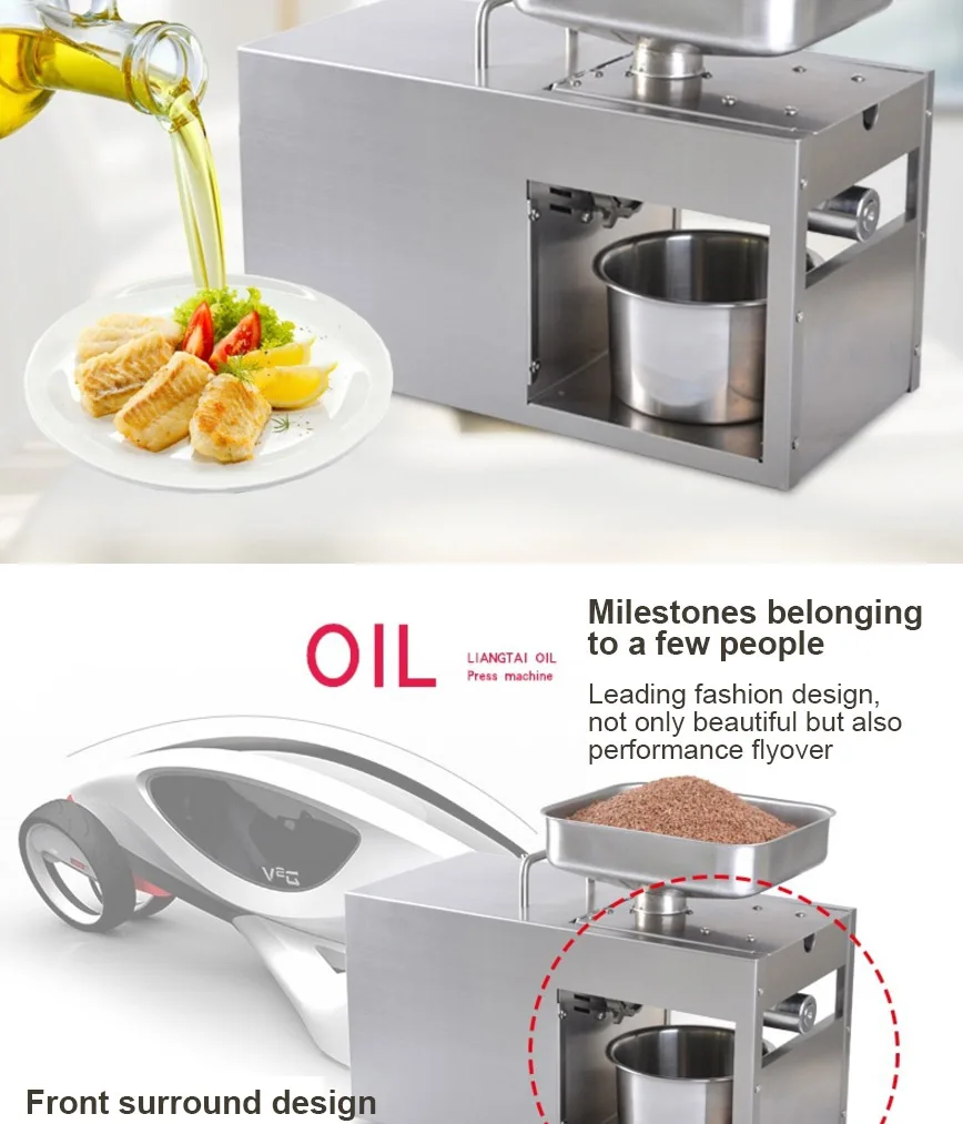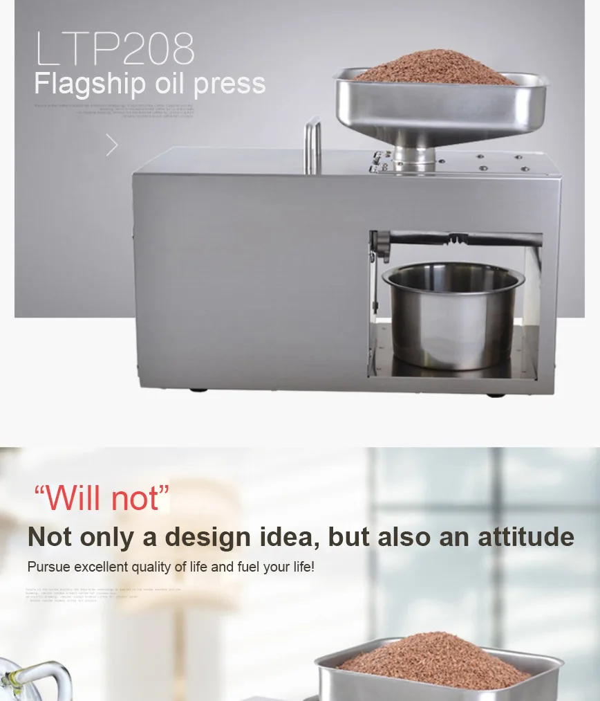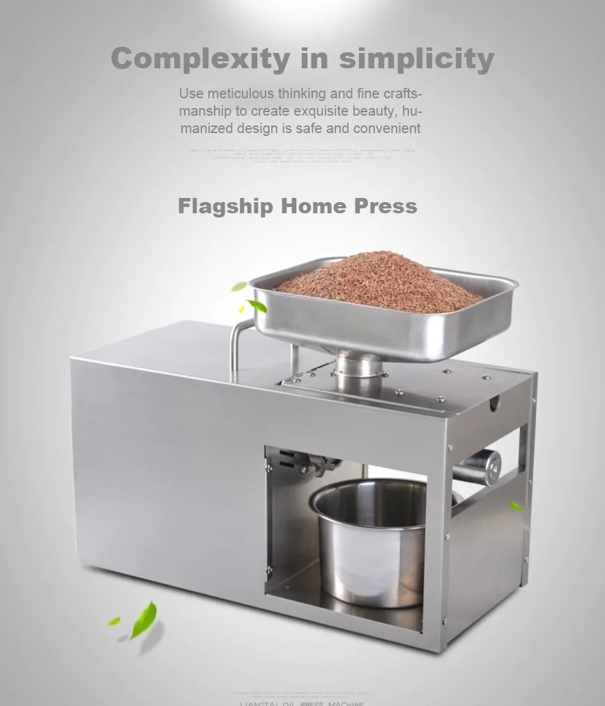 Автоматическая машина для холодного пресса из нержавеющей стали, машина для холодного прессования масла, экстрактор масла для семян подсолнечника, пресс для масла Пожалуйста, предварительно Нагрейте машину более 20 минут, а затем сделайте масло. Особенности Это одна многофункциональная домашняя машина для прессования масла (машина для холодного пресса), вы также можете использовать ее для малого бизнеса. Вы можете использовать эту машину для прессования практически всех видов семян, таких как миндаль, аргановое зерно, черный тмин, семена камелии, семена рапса (семена рапса), семена Кастора, семена ЧИА, Семена хлопка, зародыши кукурузы, съедобные фиолетовые семена периллы, семена льна (лен Абердин), семена травы, семена конопли, семена ятрофы, семена жожоба, семена киви, семена Моринги, семена неема, семена окуры, арахис, перец (сухой), ядро кедрового ореха, семена платиклади, семена колючей золы, семена тыквы, семена шиповника, Семена сафлора, шизандра, кунжут (черный кунжут и белый кунжут), соя, семена подсолнечника, орех и орехи макадамии. Если вы хотите использовать его для других семян, пожалуйста, свяжитесь с нами. Высокая скорость извлечения масла, вы можете получить 400 г масла из арахиса 1000 г. Простота в эксплуатации (руководство на английском языке) и может быть непрерывной работой без вздутия или перегрева. Мини-пространство и низкий уровень шума. Длительный срок службы, более 10 лет для домашнего использования. AC110V/60Hz, 220V/50Hz или 220V/60Hz доступен с штепсельной вилкой Великобритании/США/Австралии/ЕС