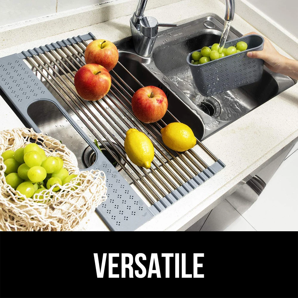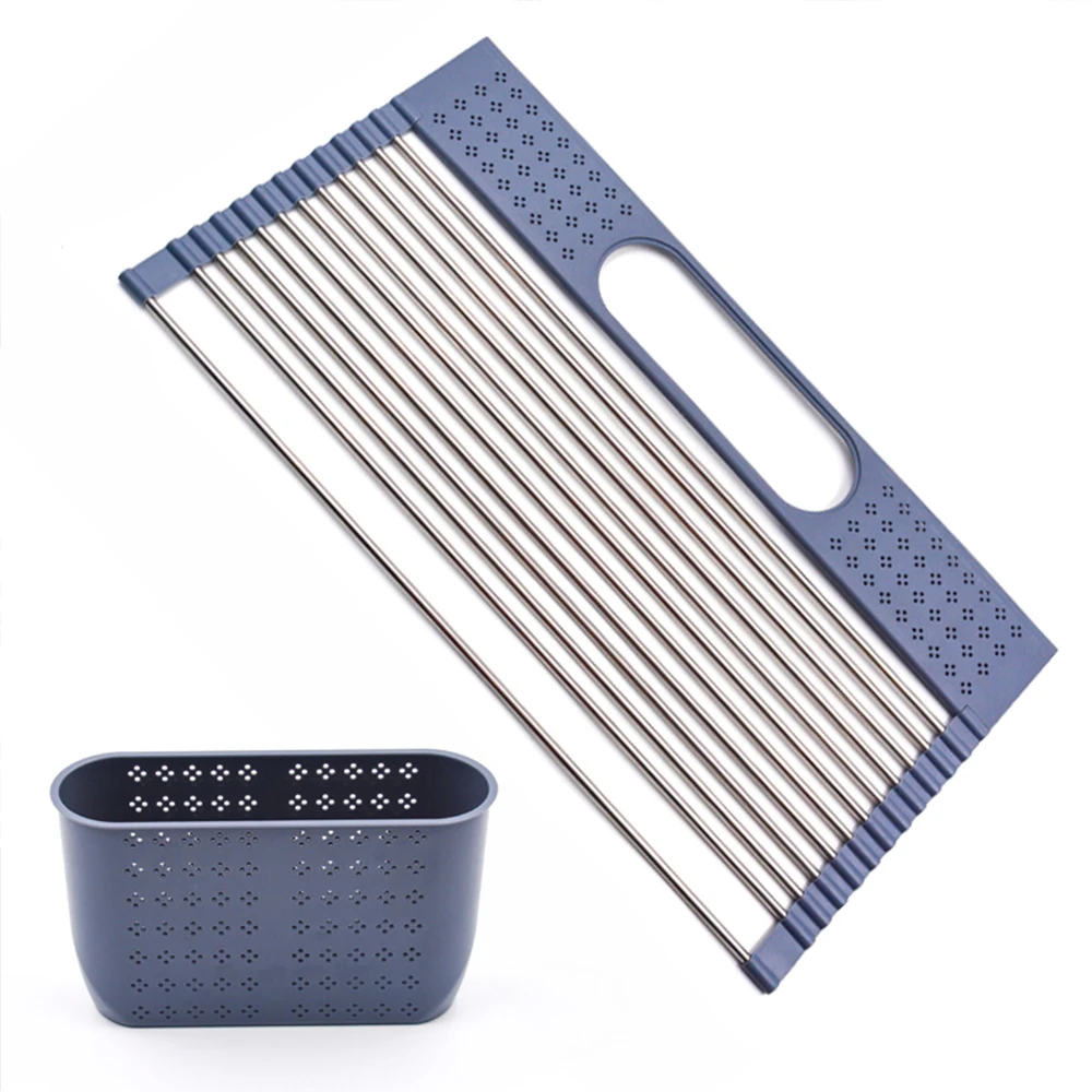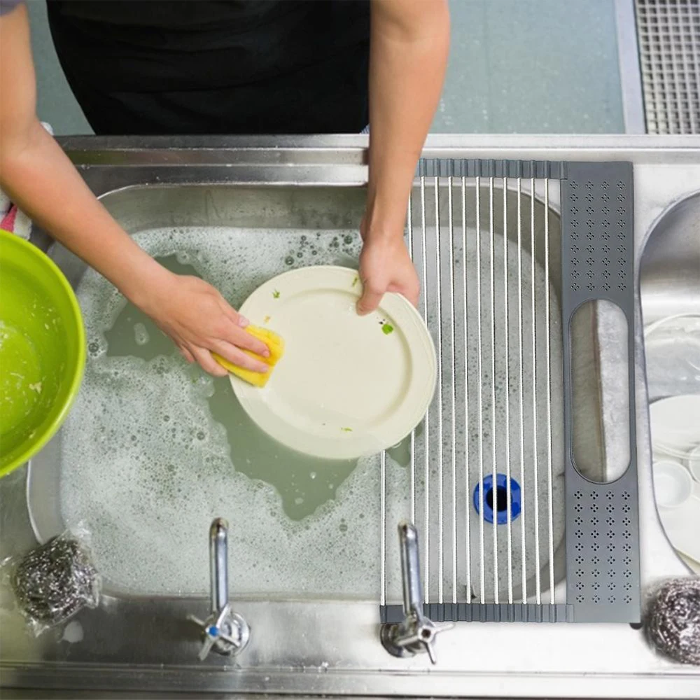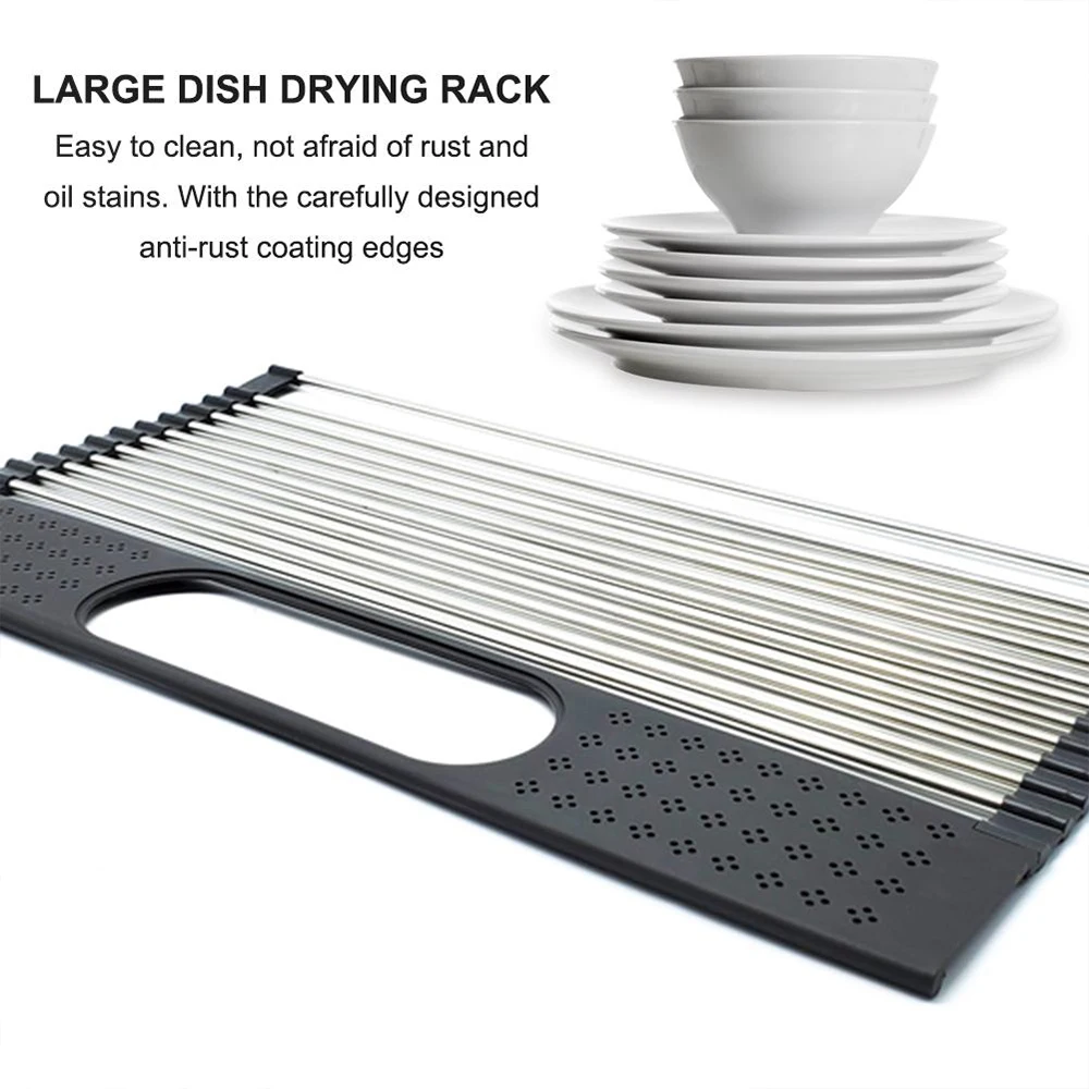 Сушилка для посуды 20x11 над раковиной закатывается большая сушилка для посуды, многофункциональная Складная подставка для кухонной раковины из нержавеющей стали с силиконовыми ободками для блюд, чашек, фруктов и овощей