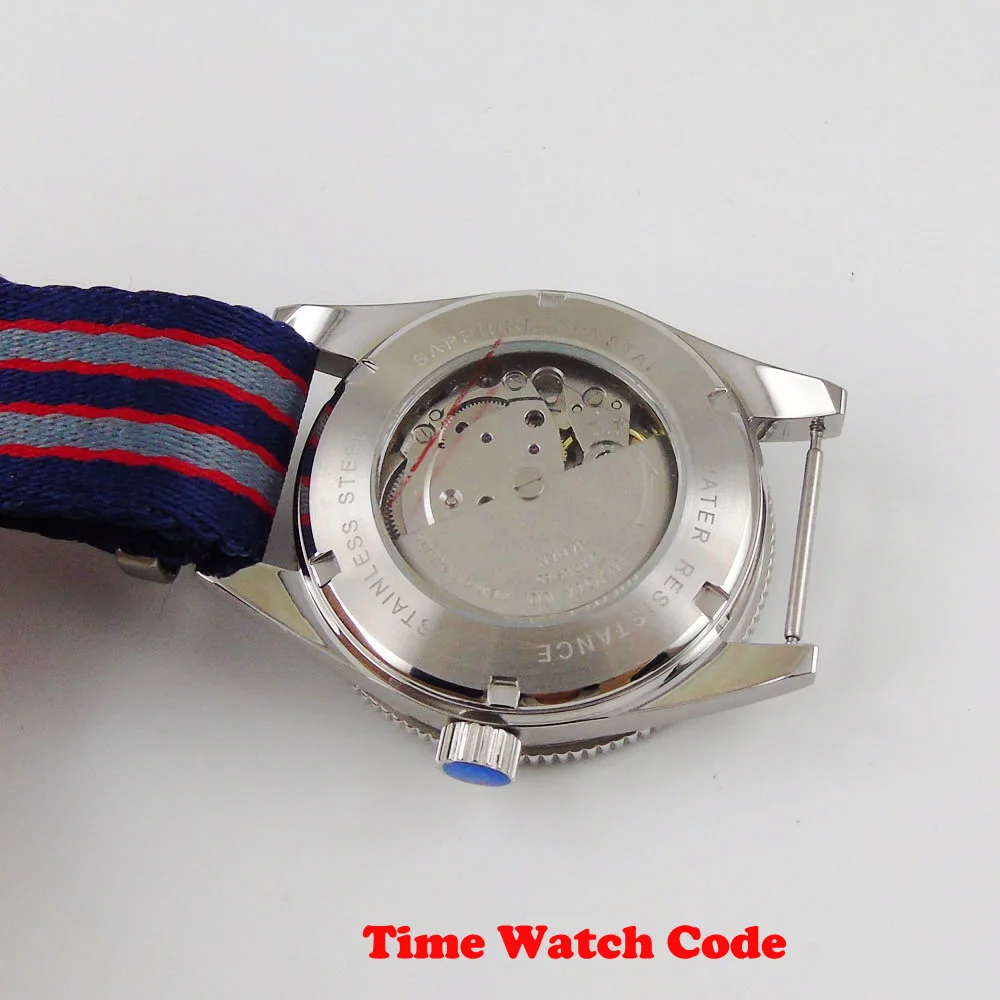 -- Механизм: ST1612 или Miyota 8215 автоматический (с автоподзаводом) механизм -- Функция: окошко даты в положении 3 дюйма -- Чехол: матовый чехол из нержавеющей стали 316L с керамической рамкой -- Размер Чехла: диаметр 41 мм, толщина 14 мм -Циферблат: синий циферблат со светящимися метками и стрелками -- Тип застежки: нержавеющая сталь с обычной пряжкой -Ремешок для часов: нейлоновый ремешок шириной 20 мм -- Водонепроницаемость: 3 АТМ -- Стекло: сапфировое стекло