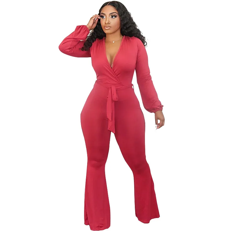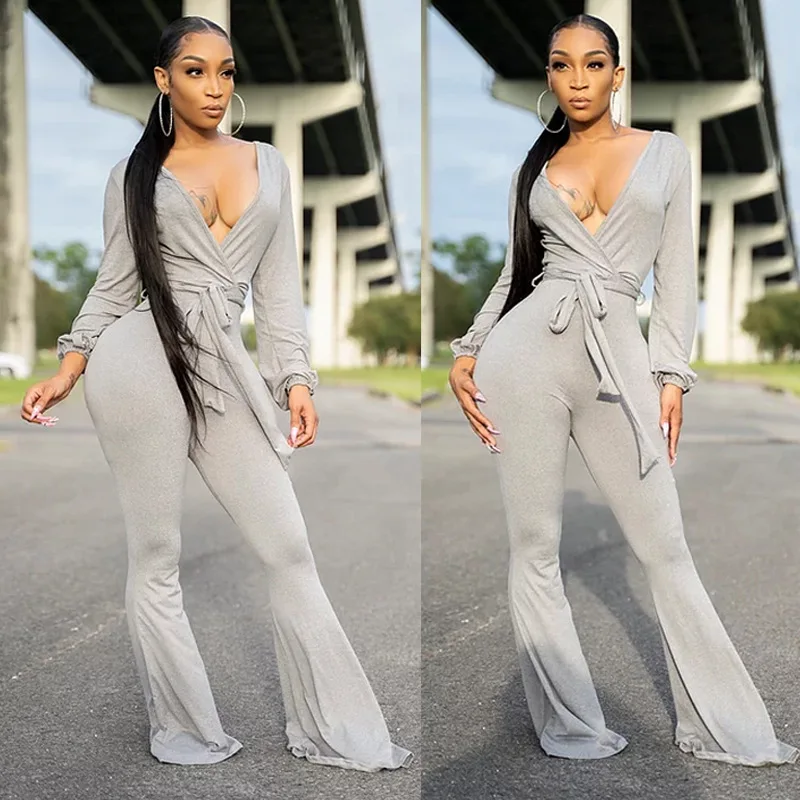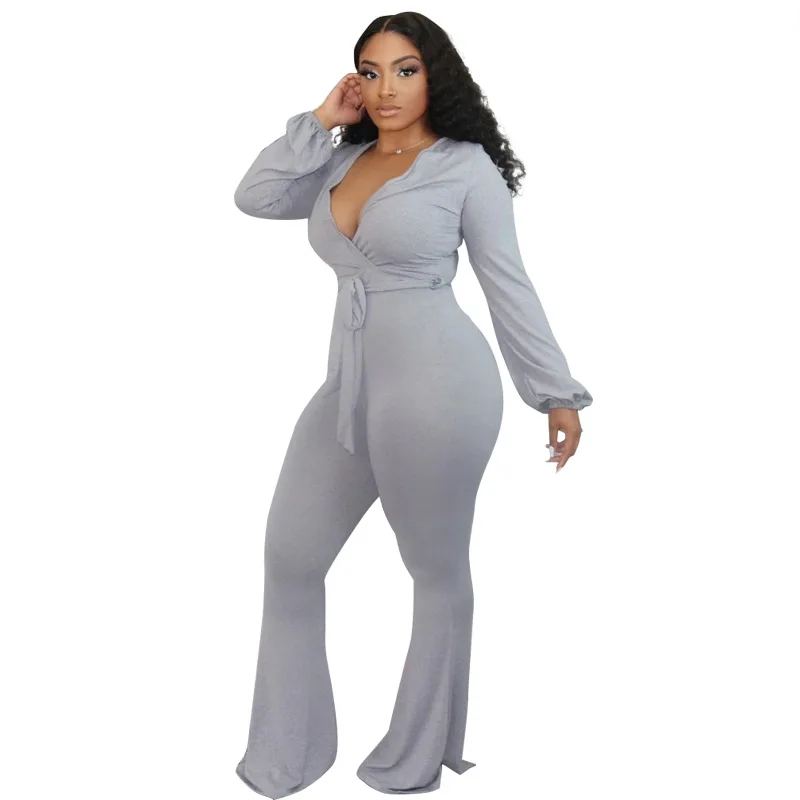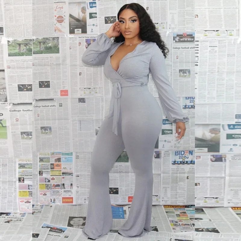 Женский комбинезон на шнуровке, однотонный повседневный комбинезон большого размера с V-образным вырезом и длинным рукавом, брюки с высокой талией и низким вырезом