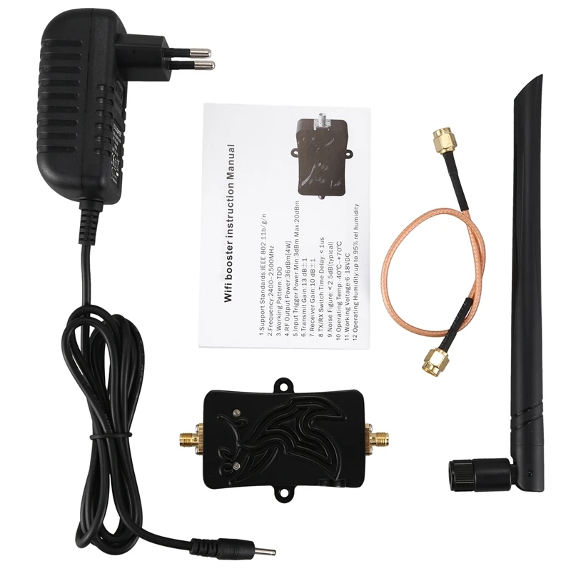 20X Мощность, улучшая качество связи и охват сертифицированных WLAN devices.2.5dB ультра-низкий уровень шума. Широкий 6-16 в рабочий диапазон ввода. Работает с сертифицированными устройствами беспроводной локальной сети IEEE 802.11b/g/n. Просто подключи и играй, программное обеспечение не требуется.