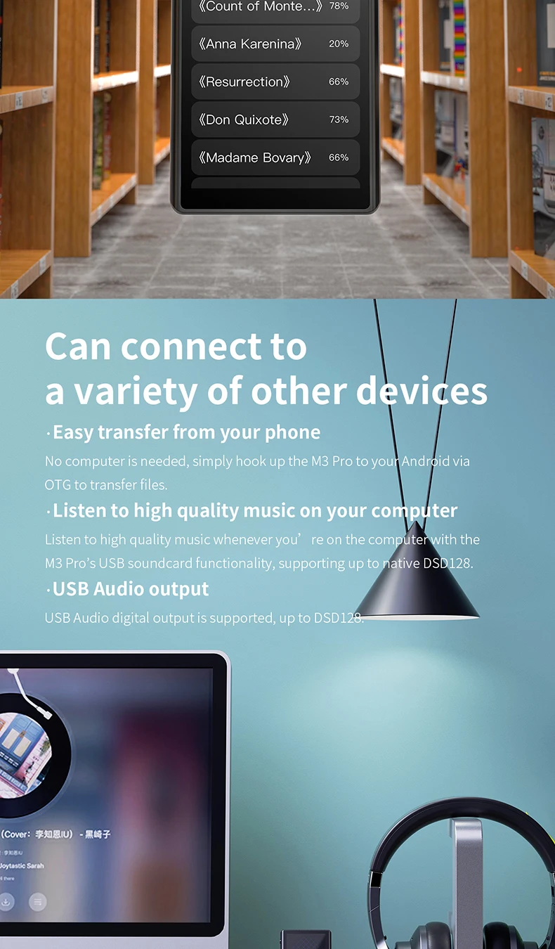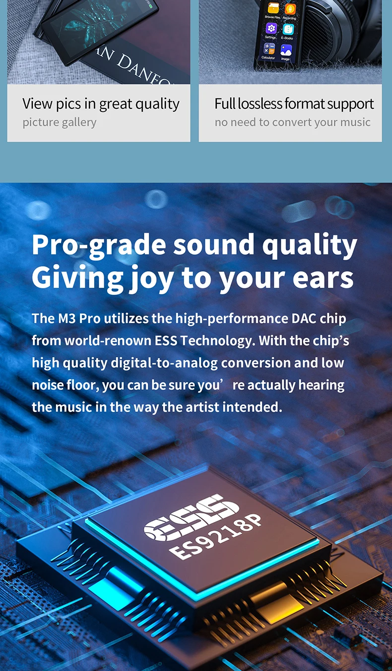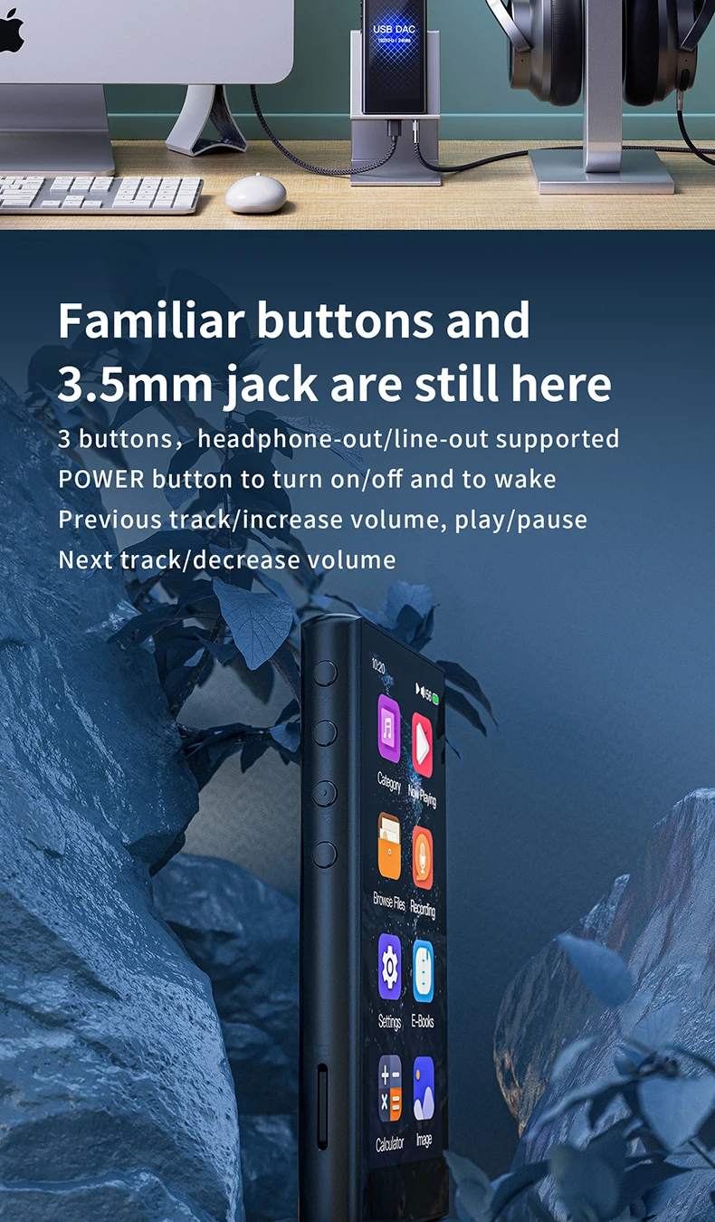 Модель процессора: Ingenic X1000E Рабочая Частота процессора: 1 ГГц ЦАП: ES9218P USB: двусторонний Тип C USB2.0 (зарядка/передача данных/USB DAC/USB аудио) Выход наушников: 3,5 мм Кнопки: Физическая кнопка + сенсорный экран Usb-цап: до 384khz-32 бит/DSD128 Емкость аккумулятора: 1000 мАч Максимальное расширение памяти: одна карта до 2 ТБ (теоретически) Время зарядки: <2 ч (DC5V/2A) Время глубокого сна: 35 дней 3,5 мм выход для наушников: >15h Поддержка формата файлов: Без потерь DSD:DSD64,128(“.iso” “.dsf”,“.dff”) APE (быстрая): 384 кГц/24 бит APE (нормальный): 96 кГц/24 бит APE (высокий): 96 кГц/24 бит APE (очень высокий): без поддержки APE (безумный): без поддержки FLAC: 384 кГц/24 бит WAV: 384 кГц/32 бит Aiff:192 кГц/32 бит Aif:192 кГц/24 бит WMA без потерь: 96 кГц/24 бит Apple Lossless: 192 кГц/24 бит Сжатие лосси: MP3, OGG, WMA, AAC и т. Д.