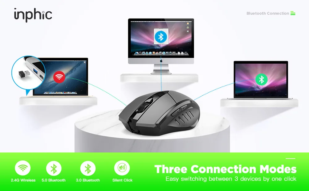 2,4G Wirerless = Используйте только usb-приемник для подключения к компьютеру 2,4G + Bluetooth 3,0 + Bluetooth 5,0 = вы можете использовать как usb-приемник, так и Bluetooth для подключения к компьютеру (наша поддержка Bluetooth 3,0 и 5,0)