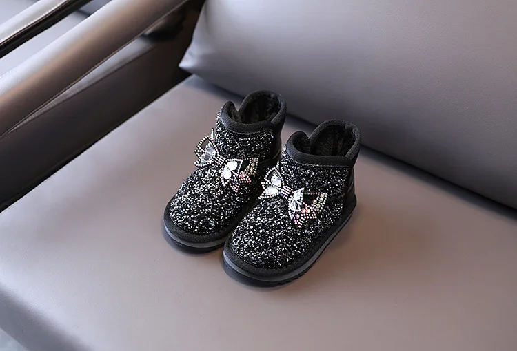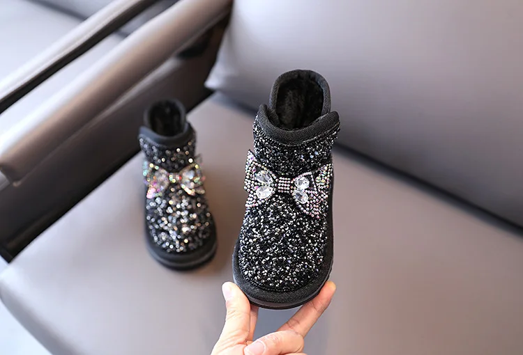 Зимние детские зимние ботинки; Детская брендовая обувь с бантом; Ботильоны для маленьких девочек; Серебристая обувь со стразами для малышей; Теплые ботинки принцессы; Новинка