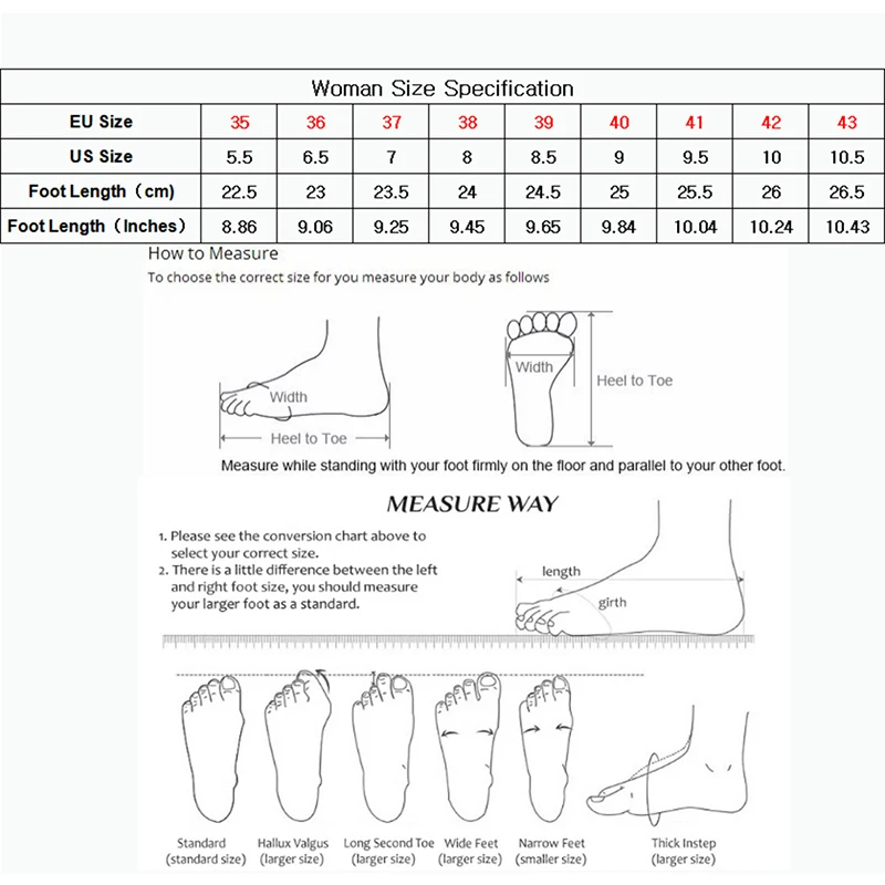 Внимание:1. Цвет может немного отличаться из-за настроек монитора компьютера.2. Из-за разницы в способах измерения допускается отклонение в размере на 1-3 см (1 см = 0,39 дюйма). Спасибо за понимание!3.Наш размер не является стандартным европейским размером, и он равен только длине стопы!4.Стандарт размера в разных странах и разных производителях отличается, длина вашей стопы является единственным критерием выбора размера.