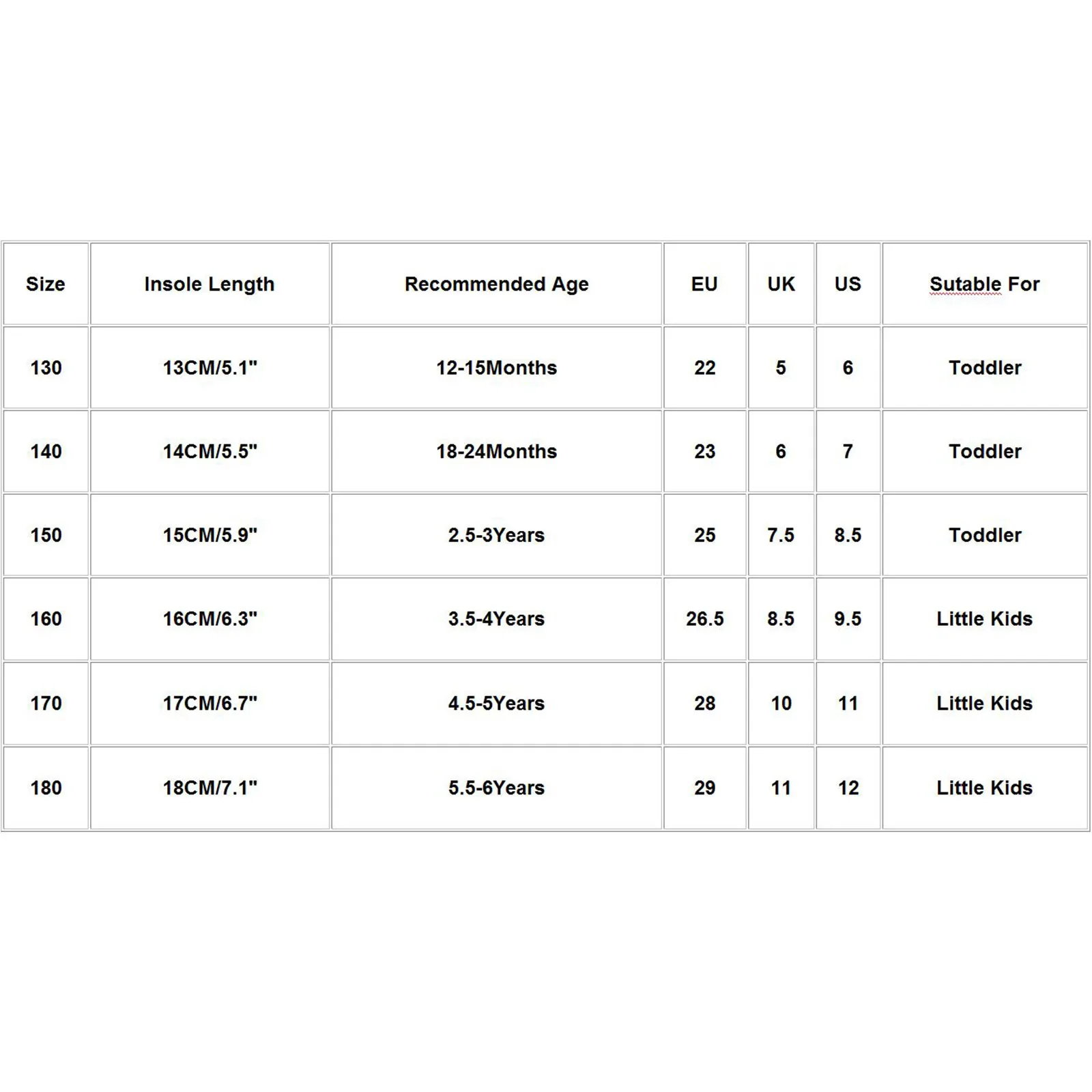 Размер Длина стельки Рекомендуемый возраст ЕС Великобритания США Sutable для 130 13 см/5,1" 12-15Months 22 5 6 Для малышей 140 14 см/5,5" 18-24Months 23 6 7 Для малышей 150 15 см/5,9" 2,5, для возраста до 3 лет 25 7,5 8,5 Для малышей 160 16 см/6,3" 3,5-4 лет 26,5 8,5 9,5 Маленькие дети 170 17 см/6,7" 4,5-5 лет 28 10 11 Маленькие дети 180 18 см/7,1" 5,5-6 лет 29 11 12 Маленькие дети
