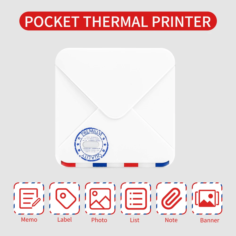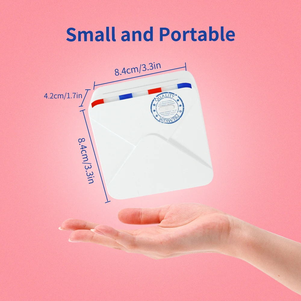Карманный принтер:Компактный и простой, как маленькая квадратная книга, легко носить с собой. 300 точек/дюйм высокой четкости печати, 15-53 мм ширина бумаги, хороший и прозрачный эффект печати.