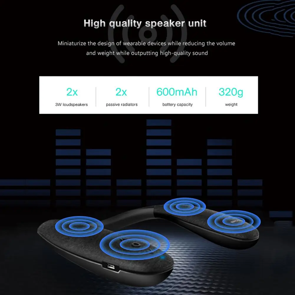 1. Портативный и портативный динамик. Поместите носимый Bluetooth-динамик на шею, чтобы освободить руки и уши, будь то готовка или занятия спортом на открытом воздухе, например, прогулка, езда на велосипеде, альпинизм и т. д. все могут наслаждаться музыкой. Освободите руки и уши, Наслаждайтесь музыкой, отвечайте на звонки и все еще Оставайтесь на связи со всем мире.2. Объемный звук, не только музыка. Динамики направлены вверх к ушам, уши свободны, вы можете максимально услышать звук и минимизировать звук других людей вокруг вас. Вы сможете понимать окружающую обстановку в любое время при прослушивании музыки. Принесите ближе к музыке и оставайтесь на связи со всем миром.3. Водонепроницаемая конструкция и длительный срок службы батареи. Этот водонепроницаемый беспроводной динамик устойчив к поту и погоде. Особенно подходит для любителей игр и занятий спортом на открытом воздухе. Он может играть до 12 часов на одном заряде аккумулятора с литиевая полимерная аккумуляторная батарея.4. Легкий и удобный в носке. Эргономичная форма, мягко наклоняющаяся на плечи, создает небольшое стерео-Объемное звучание, позволяющее комфортно слушать музыку весь день.5. 3D кинотеатр стерео. Беспроводные Bluetooth-динамики со встроенной акустической системой 3 Вт * 2, а динамики, расположенные вверх, обеспечивают глубокий и богатый звук, создавая по-настоящему уникальный и захватывающий звук. Носимые динамики отлично подходят для любителей домашнего кинотеатра и игр. Портативные персональные динамики, оснащенные улучшенным Bluetooth 5,0, могут обеспечивать большой беспроводной диапазон и более стабильное соединение Bluetooth.Спецификация:Источник питания: перезаряжаемый литиевый аккумулятор на выходеВстроенный аккумулятор: 600 мАчМощность: 3 Вт * 2, стереоBluetooth: 5,0Аудиовход: беспроводнойРабочее расстояние: около 20 м/787,40 дюйма максимумВремя работы: до 10 часовДинамик: около 33 мм/1,30 дюймаЦвет: черныйВес нетто: около 242 гУпаковочный лист:1 х беспроводной Bluetooth-динамик1 x USB-кабель для зарядки 1 x Руководство пользователя
