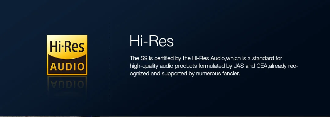 S9 сертифицирован Hi-Res Audio, который является стандартом для высококачественной аудиопродукции, разработанной JAS и CEA, уже признанной и поддерживаемой многочисленными fanciers.