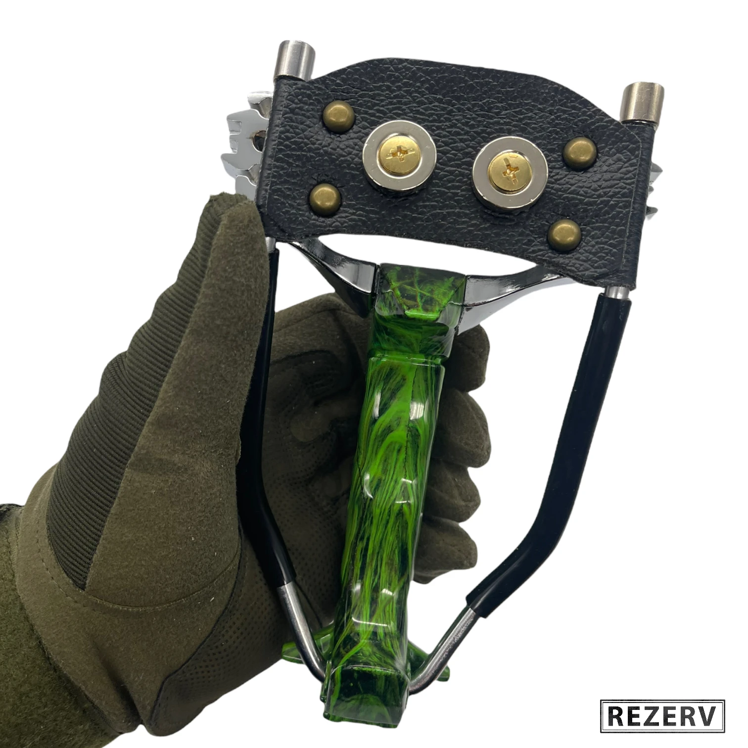 On the tip of the slingshot there are 2 neodymium magnets, which can be fixed with throwing shells (steel balls, harpunes).