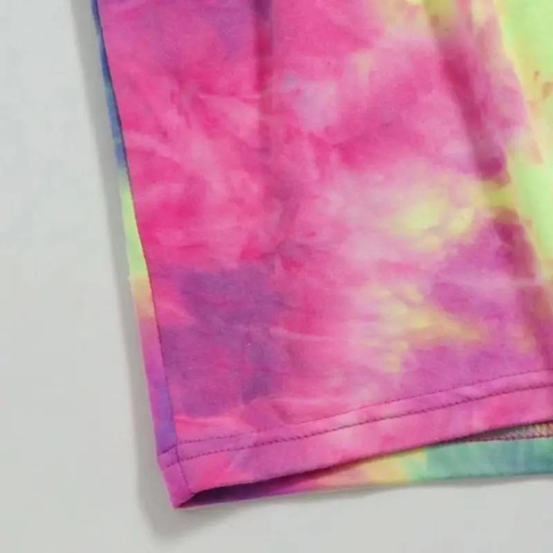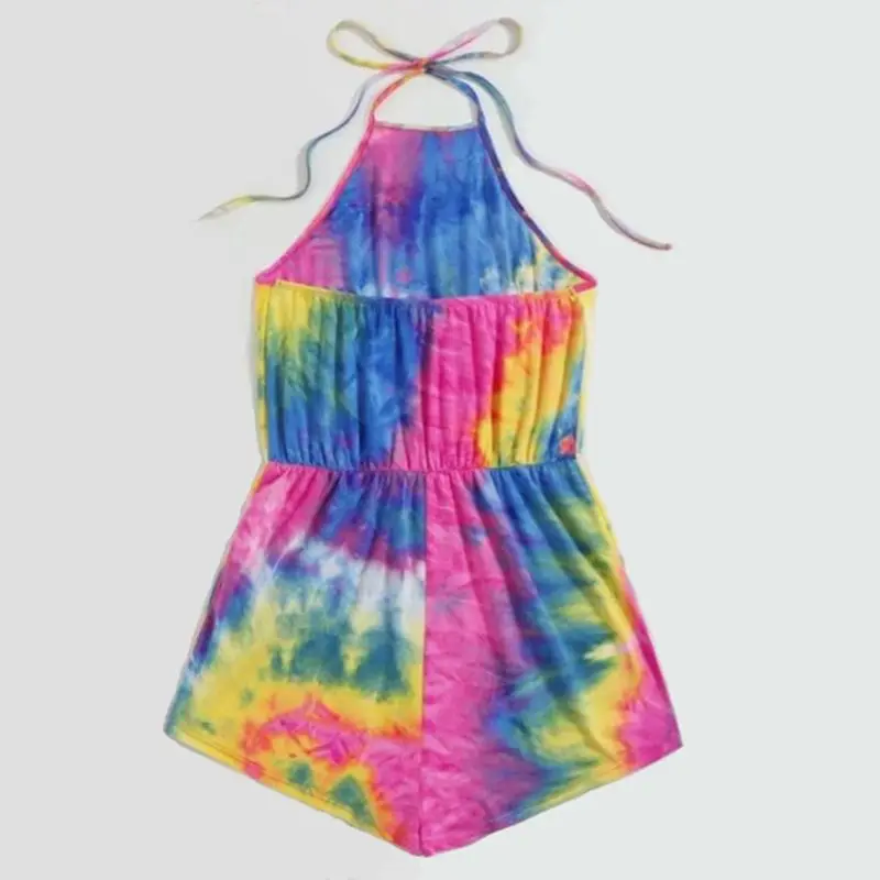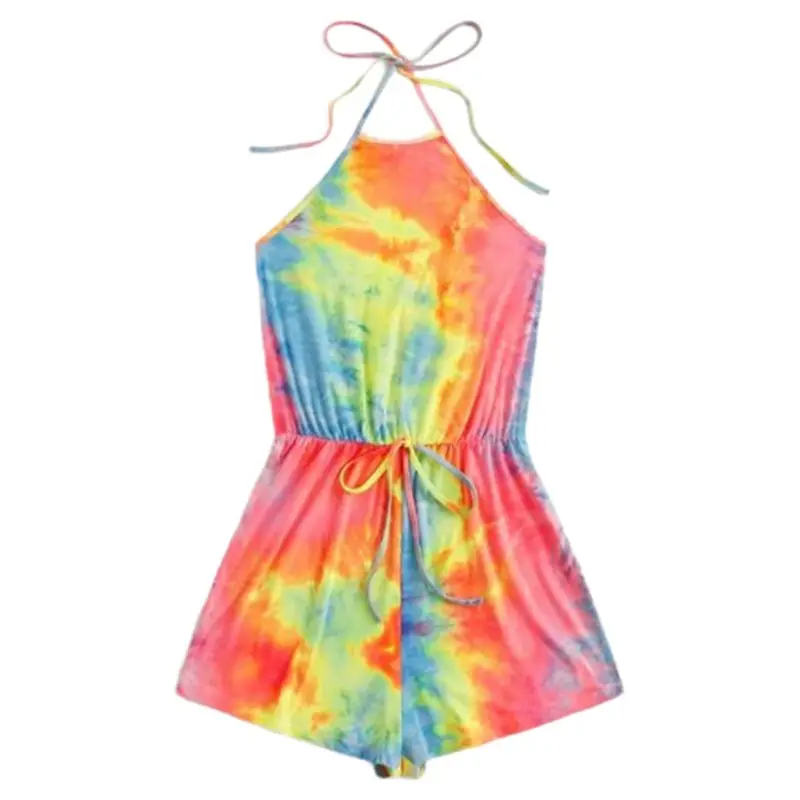 Sleeveless, self-tie lace-up halter neck, sexy backless, neon rainbow colorful gradient tie-dye printing.